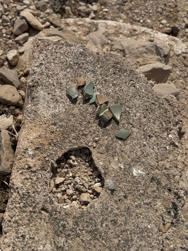 وقد وجدت في المقبرة بعض اللقى السطحية مثل شظايا الفخار التقليدي غير المزجّج، وكمية من أطباق القاشياني المكسورة، والتي تدل على وجود نشاط بشري قديم في محيط المقبرة، ربما ارتبط بالرعي أو الاستيطان المؤقت، أو باستخدام الوادي كمجال معيشي موسمي.