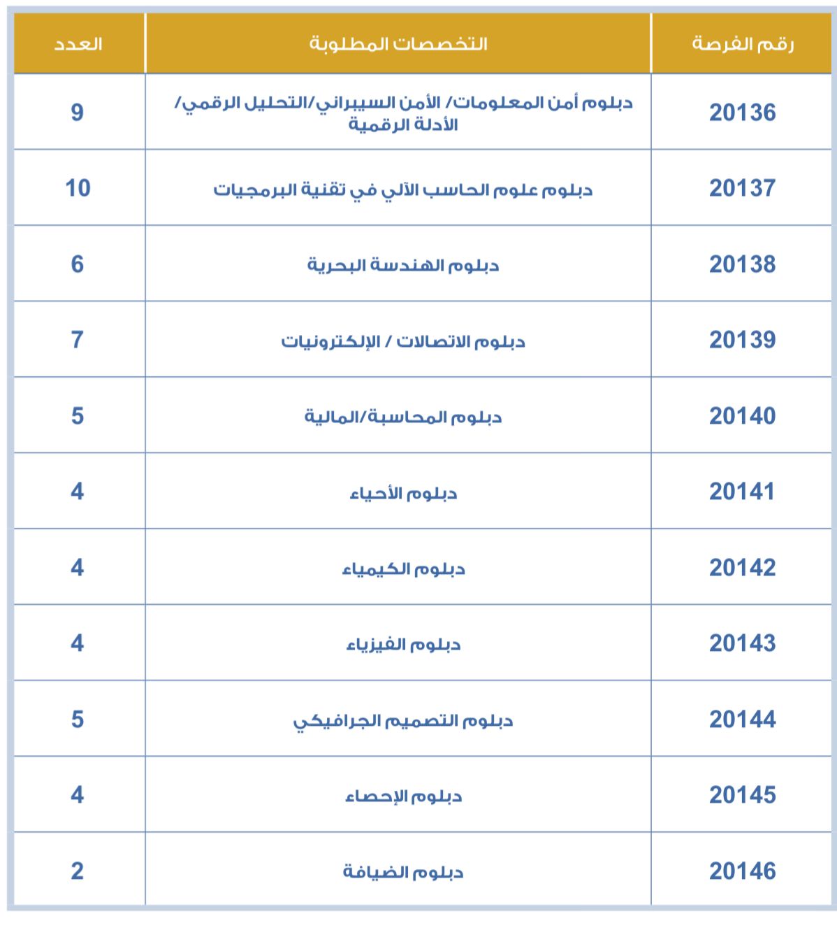 أعلنت وزارة العمل بالتنسيق مع شرطة عُمان السلطانية عن فتح باب التجنيد لحملة الدبلوم وما بعد دبلوم التعليم العام (ذكور) وفق الصورة المرفقة، وذلك خلال الفترة من 1 إلى 5 فبراير 2026م، في 11 تخصصًا.