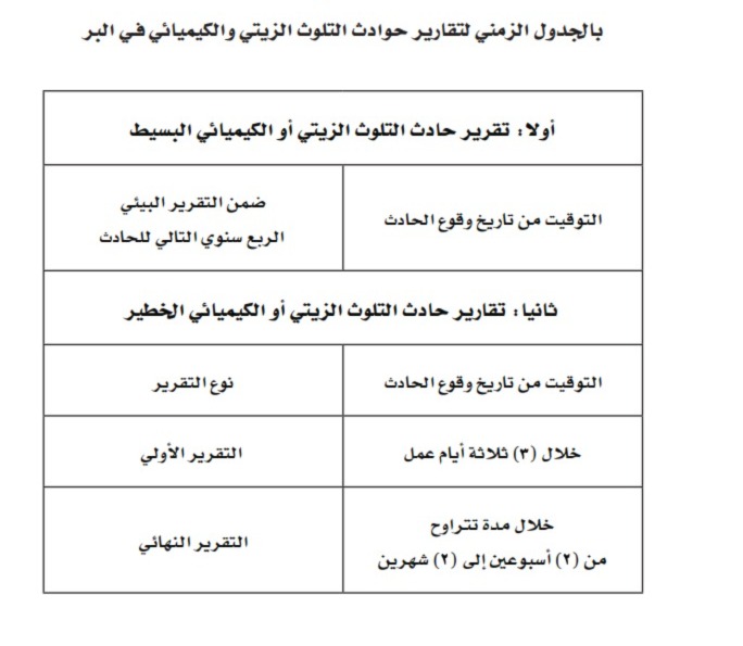 كما أشارت اللائحة بأنه يجب على المالك تزويد الهيئة بتقرير أولي ونهائي حول حادث التلوث الزيتي أو الكيميائي البسيط، وتقرير أولي ونهائي حول حادث التلوث الزيتي أو الكيميائي الخطير، وذلك وفقًا للنموذج المعد في هذا الشأن، على أن يتم تقديم التقارير المشار إليها خلال المدد الزمنية المحددة وفق الملحق المرفق.
