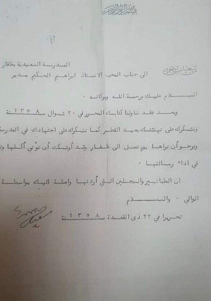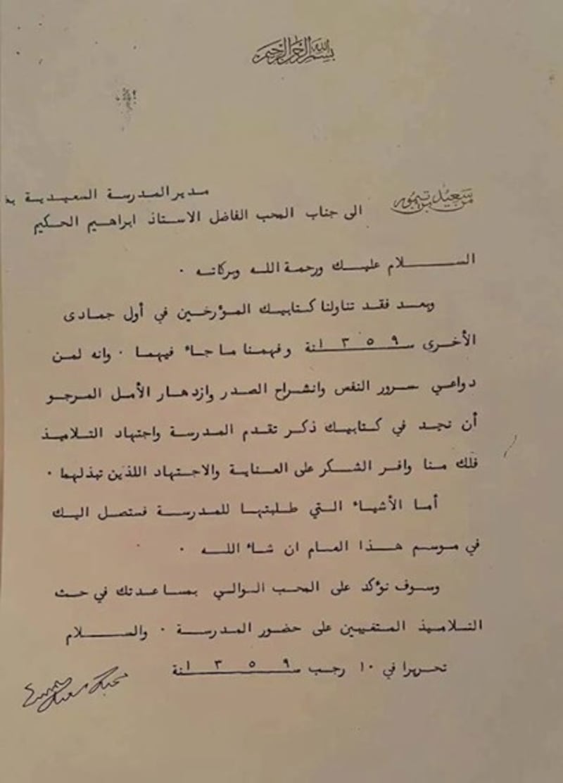 وبعد فقد تناولنا كتابيك المؤرخين في أول جمادى الأخرى 1359هـ، وفهمنا ما جاء فيهما، وإنه لمن دواعي سرور النفس، وانشراح الصدر، وازدهار الأمل المرجو أن نجد في كتابيك ذكر تقدم المدرسة واجتهاد التلاميذ، فلك منّا وافر الشكر على العناية والاجتهاد اللذين تبذلهما.