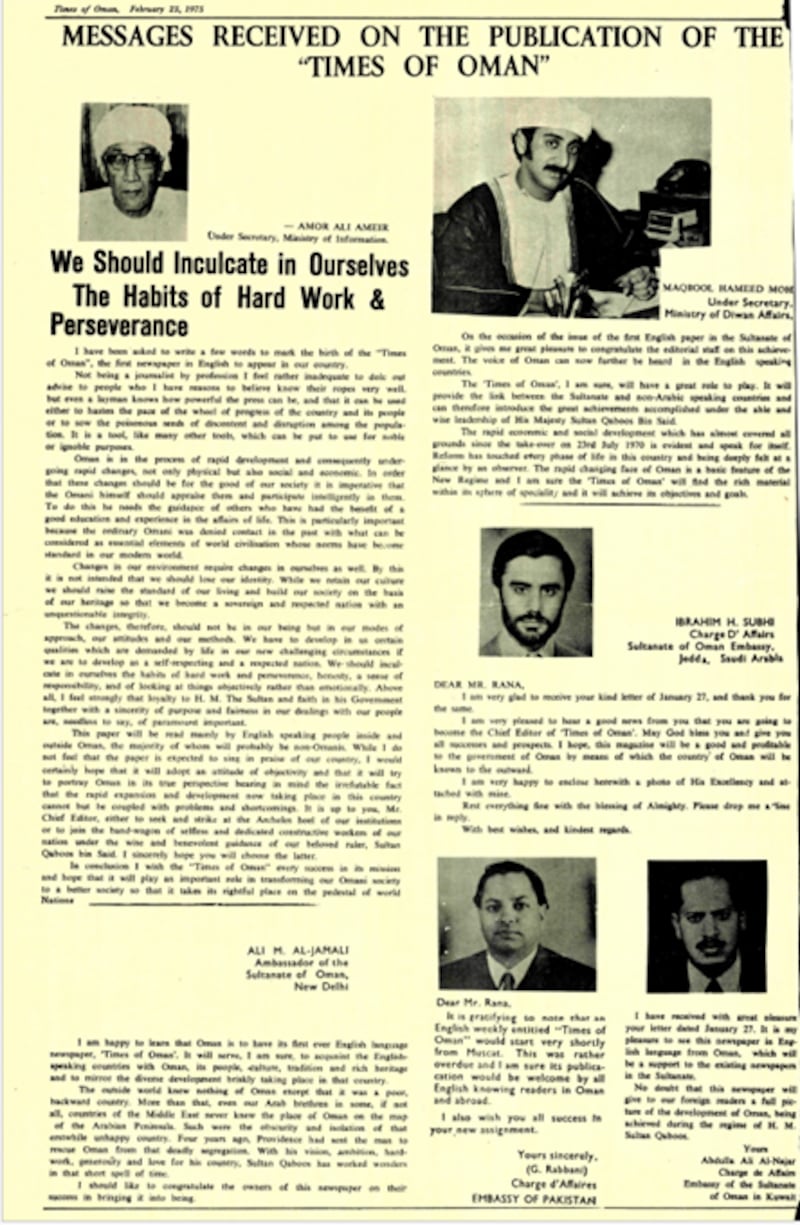 شكّل صدور صحيفة «تايمز أوف عُمان» باللّغة الإنجليزية محطةً إعلاميةً بارزة في مسيرة النهضة الحديثة في سلطنة عُمان، وهو ما عكسه حجم التفاعل الرسمي والدبلوماسي الذي حظي به العدد الأول، من خلال رسائل تهنئة عبّرت عن إدراك مبكر لدور الصحافة في البناء الوطني والتواصل مع العالم، قدّمها كلٌ من: الأستاذ عامر بن علي بن عمير وكيل وزارة الإعلام وقتها، ومقبول حميد وكيل وزارة شؤون الديوان، والأستاذ إبراهيم الصبحي القائم بالأعمال في سفارة سلطنة عُمان بالمملكة العربية السعودية (جدة)، والأستاذ علي بن محمد الجمالي سفير سلطنة عُمان بالهند، وج. رباني قائم بالأعمال في سفارة باكستان بمسقط، والأستاذ عبدالله النجار قائم بالأعمال في سفارة سلطنة عُمان بالكويت.