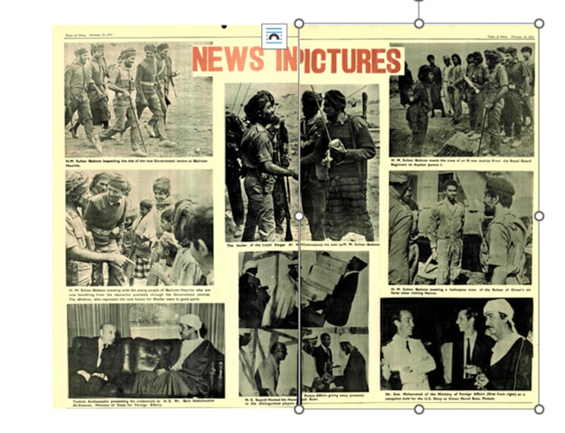 جسّدت صفحة News in Pictures من عدد 23 فبراير 1975م لصحيفة Times of Oman البعد البصري للنهضة العُمانية في بداياتها، من خلال لقطات ميدانية توثّق حضور القيادة بين المواطنين، وزيارات المواقع التنموية والعسكرية، والتواصل المباشر مع الشباب وأفراد القوات المسلحة، إلى جانب مشاهد دبلوماسية رسمية. وتعكس الصور اعتماد الصحيفة منذ عددها الأول على الصورة الصحفية بوصفها شاهدًا حيًا على التحولات الوطنية، ووسيلة فاعلة لنقل روح المرحلة وبدايات بناء الدولة الحديثة.