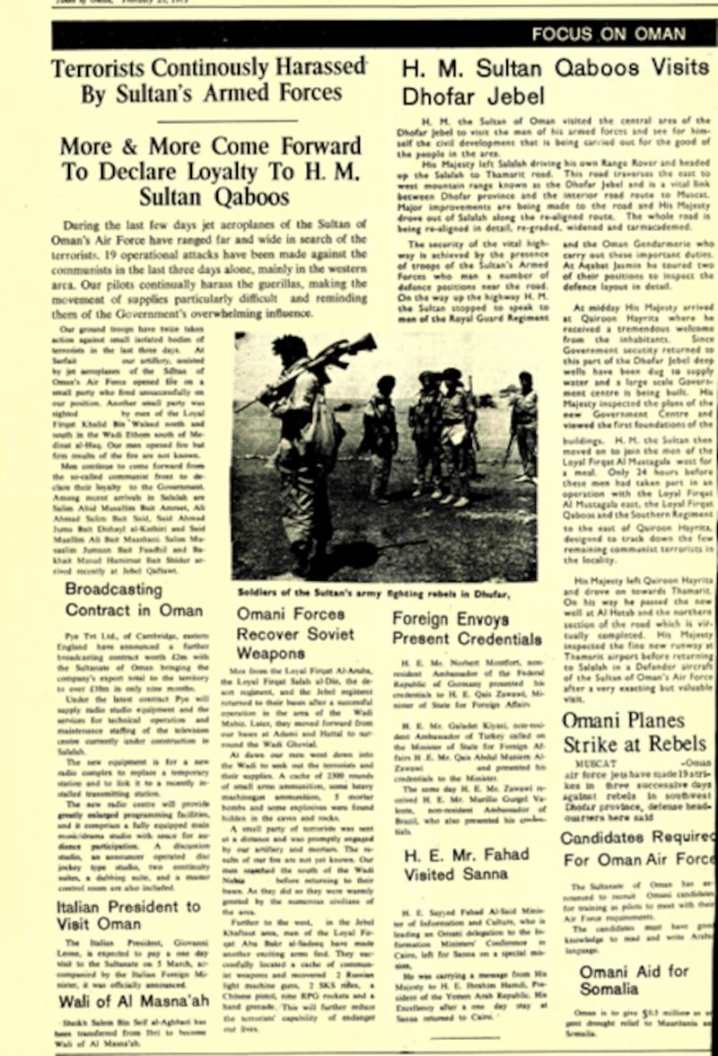 عكست هذه الصفحة الإخبارية من العدد الأول لصحيفة Times of Oman تركيز الصحيفة المبكر على الشأن الوطني والأمني والتنموي، فقد أبرزت التطورات الميدانية في ظفار، مؤكدة استمرار جهود القوات المسلحة في فرض الاستقرار، وتزايد إعلان الولاء للدولة، إلى جانب تغطية زيارة السلطان قابوس لمناطق جبل ظفار ومتابعته الأوضاع الأمنية والتنموية عن قرب. كما شملت الصفحة أخبارًا عن العلاقات الخارجية، واستعادة أسلحة، وحضور مبعوثين أجانب، بما يعكس ملامح دولة فتية ترسخ أمنها الداخلي وتوسّع حضورها الإقليمي والدولي.