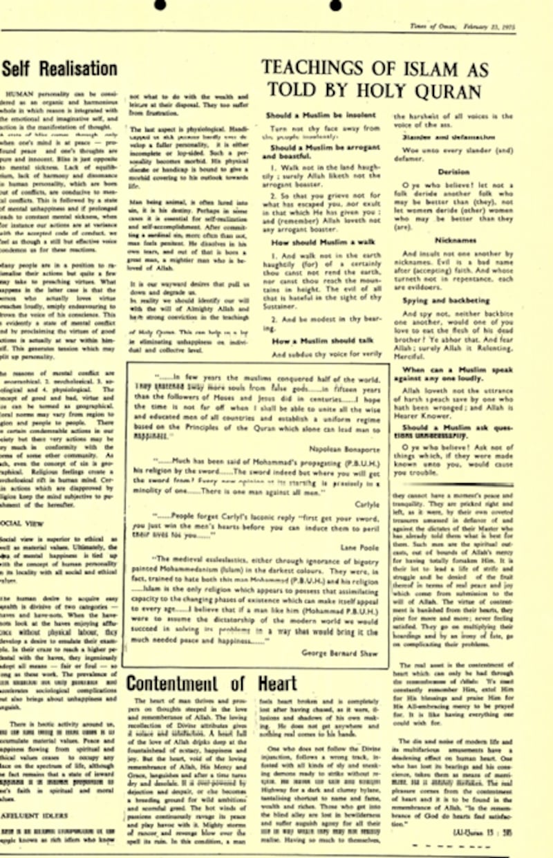 عكست هذه الصفحة من العدد اهتمام الصحيفة منذ بداياتها بالبعد الفكري والأخلاقي إلى جانب الأخبار السياسية، فقد تناولت موضوعات في تزكية النفس وتحقيق الذات، وقدّمت مختارات من تعاليم الإسلام كما وردت في القرآن الكريم حول السلوك الإنساني، والتواضع، وضبط اللسان، والعلاقات الاجتماعية، وختِمت بتأملات في قناعة القلب وطمأنينته، وأبرزت الصفحة حرص الصحيفة على الجمع بين الرسالة الإعلامية والمعالجة القيمية، بما ينسجم مع هوية المجتمع العُماني ورؤيته الأخلاقية في مرحلة التأسيس.
