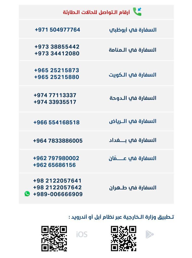 ودعت الوزارة المواطنين إلى التواصل المستمر مع البعثات المعنية عبر أرقام الطوارئ المعلنة، والتسجيل في تطبيق وزارة الخارجية لتحديث بياناتهم وتلقي الإرشادات اللازمة.