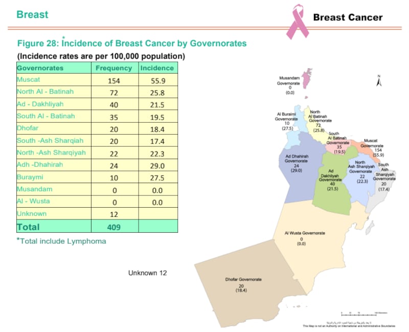 وتؤكد البيانات أن سرطان الثدي ظل في المرتبة الأولى بين جميع أنواع السرطان المسجلة في السلطنة في عام 2021م بعدد 408 حالة، مقارنة ببقية أنواع السرطان. كما استحوذ على 25% من إجمالي حالات السرطان المسجلة بين الإناث، أي ربع الحالات تقريبًا، وأكد أن إحصائية عام 2021م ما تزال في طور التنقيح النهائي، وأضاف أن جائحة كوفيد أسهمت في تأخير إصدار بعض البيانات.