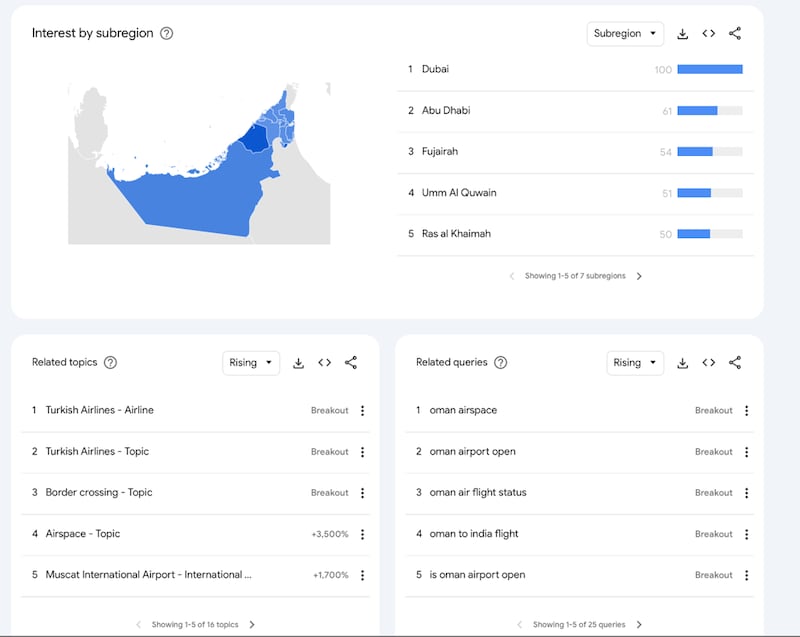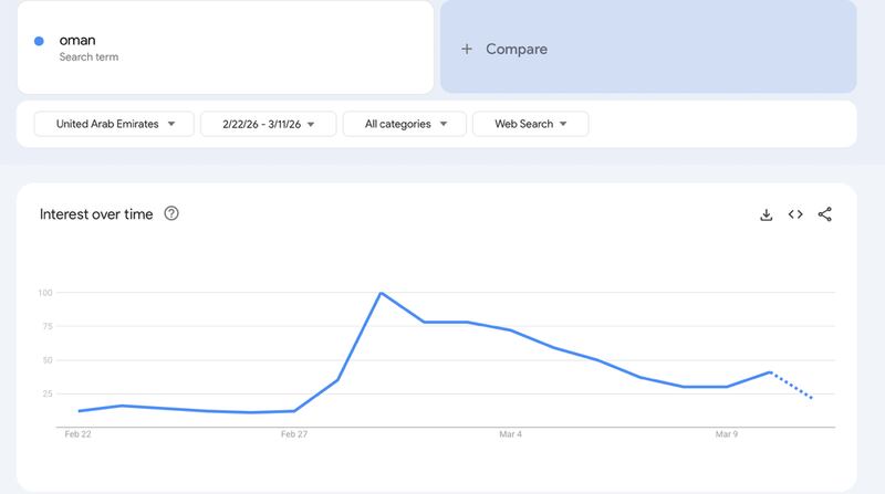 وبحسب تحليل لبيانات منصة “جوجل تريندز، فقد قفز الاهتمام بعمليات البحث عن كلمة “Oman” - لا سيما من داخل دولة الإمارات- خلال أقل من 24 ساعة من مستوى اعتيادي يقارب 12 نقطة إلى 100 نقطة، وهو الحد الأقصى الذي تسجله المنصة، ويشير هذا الصعود العمودي إلى بحث محموم ومتسارع يعكس قلقًا حقيقيًا ومفاجئًا لدى شعوب المنطقة إبان الأزمة.