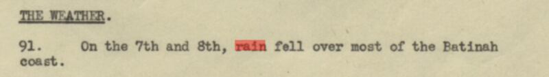 في يوميّ 6 و7 مارس 1946م، شهدت عمان أمطارًا جيدة على جميع مناطق ساحل الباطنة، وسجلت مصيرة في محطتها (42 ملم) من الأمطار بتاريخ 8 مارس، وفي يومي السابع والثامن، هطلت الأمطار على معظم ساحل الباطنة.