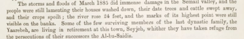 تُعد أحداث مارس 1885م من أبرز الوقائع المناخية الموثقة، حيث تشير تقارير الوكالة البريطانية في مسقط – كما أوردها كتاب “الغيث العتيق” – إلى أن يوم الاثنين 30 مارس 1885م شهد منخفضًا جويًا عامًا قويًا.