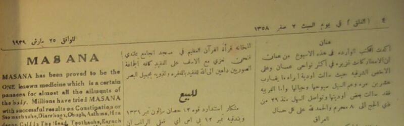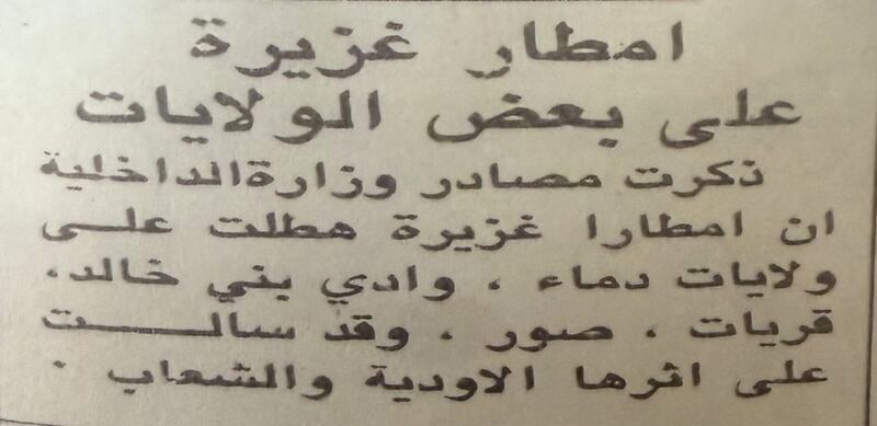في عام 1939م ووفق جريدة “الفلق” الصادرة في زنجبار بتاريخ 2 صفر 1358هـ الموافق 25 مارس 1939، فقد شهدت عمان هطول أمطار متفرقة، وسالت أودية إبراء ما يقارب عشرين مرة، وسجلت محطة مسقط كمية أمطار بلغت (21 ملم)، وهو ما يعكس حالة مطرية نشطة نسبيًا، خصوصا في الداخلية الشرقية.