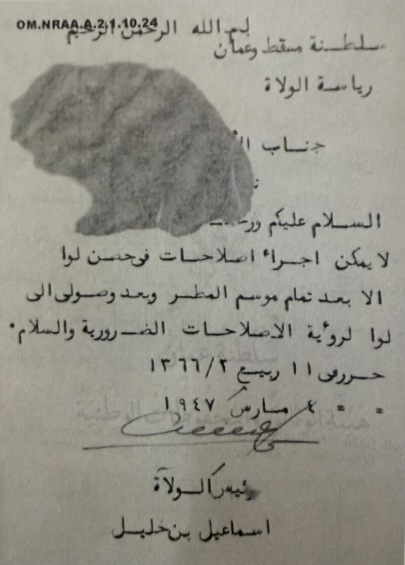 في دلالة على تأثير الأمطار في الحياة اليومية والإدارية، تبرز رسالة مؤرخة في 4 مارس 1947 من إسماعيل بن خليل الرصاصي (رئيس الولاة) إلى والي لوى، يشير فيها إلى صعوبة تنفيذ أعمال الإصلاح في حصن لوى، وضرورة الانتظار حتى انتهاء موسم المطر.