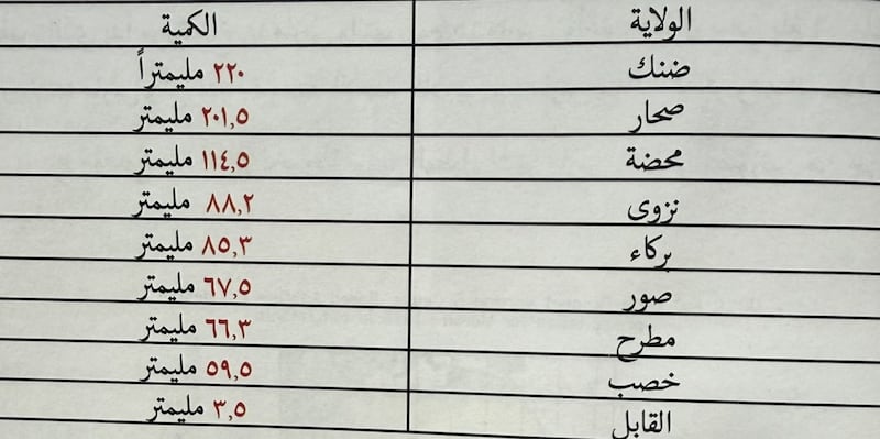 فقد سجّلت بعض الولايات كميات مرتفعة جدًا، من أبرزها ضنك: نحو 220 ملم، صحار: نحو 201 ملم، محضة: نحو 114.5 ملم. في المقابل، سجّلت مناطق أخرى كميات محدودة للغاية، مثل القابل: نحو 3.5 ملم فقط.