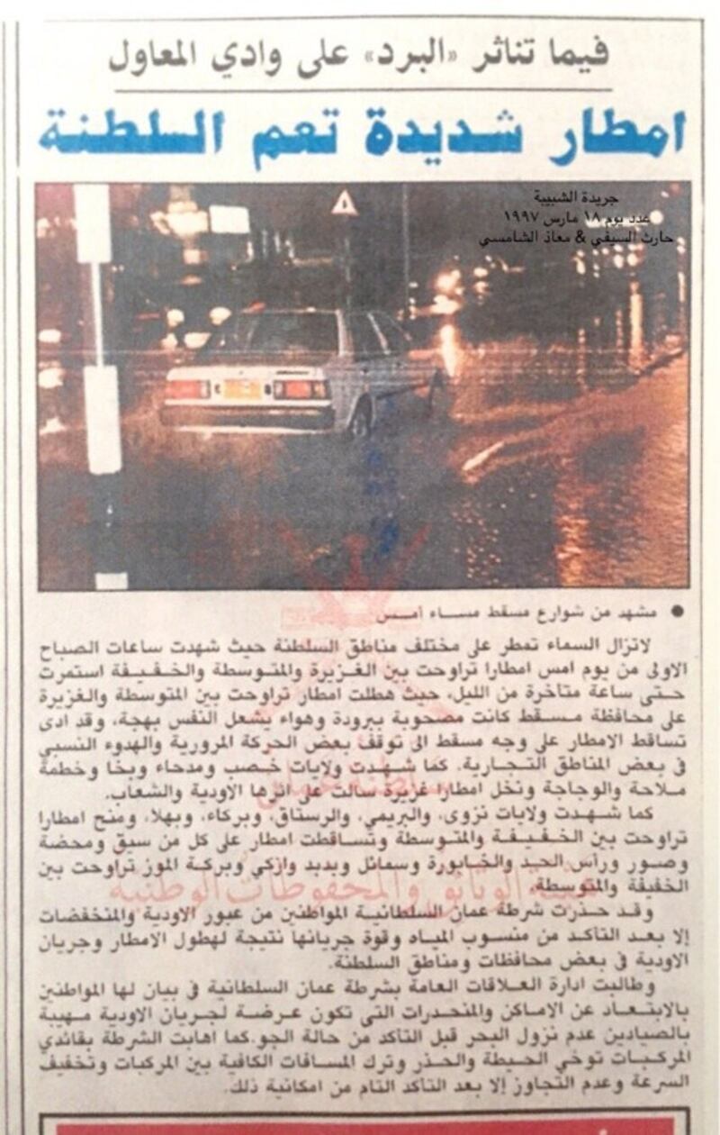 قبل خمسين عامًا، وتحديدًا في مارس 1976م تعرضت سلطنة عمان لمنخفضين جويين، الأول كان بين نهاية الثلث الأول وبداية الثلث الثاني، والمنخفض الثاني الأطول نفسًا والأكبر تأثيرًا بين 18 إلى 25 مارس وتسبب في حدوث أودية جارفة خصوصا في مناطق شمال عمان مثل الظاهرة، وشمال الباطنة.