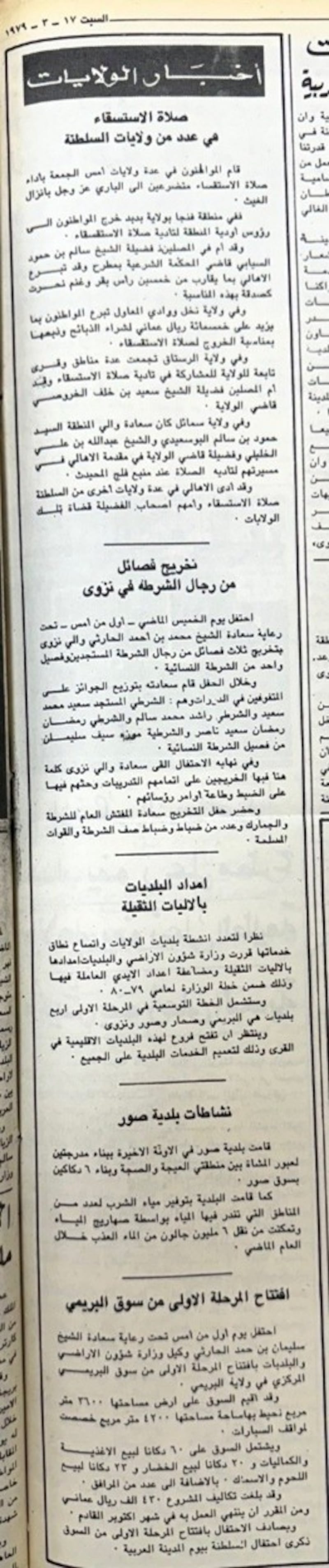 في عددها الصادر يوم السبت 17 مارس 1979م أوردت جريدة “عمان” عددًا من الأخبار المحلية من ضمنها: قيام المواطنون في عدد من ولايات السلطنة بإقامة صلاة الاستسقاء، وتخريج ثلاث فصائل من رجال الشرطة المستجدين وفصيل واحد من الشرطة النسائية وذلك تحت رعاية الشيخ محمد بن أحمد الحارثي والي نزوى.