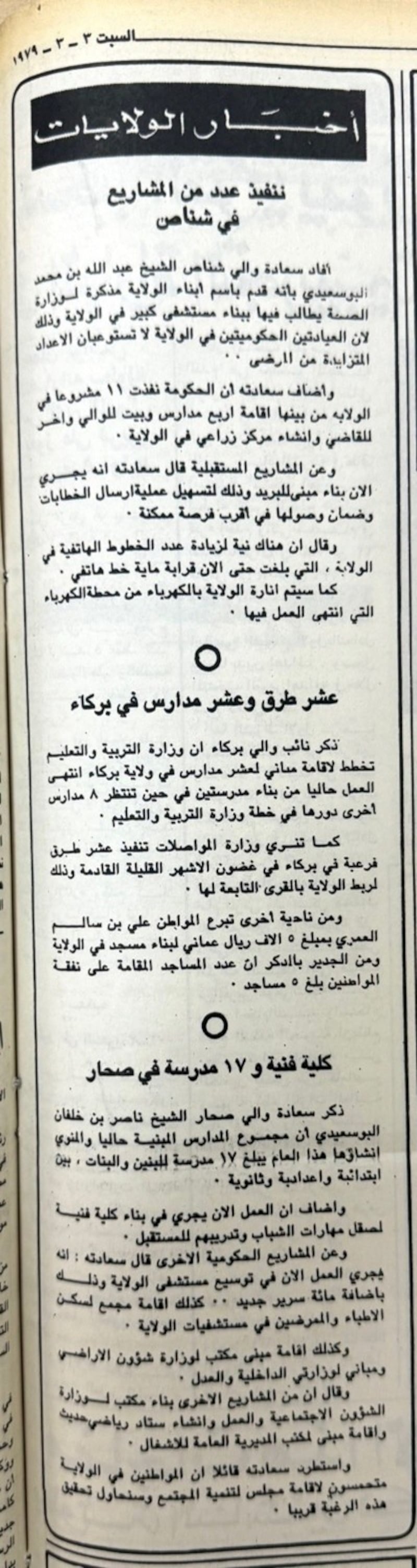 وفي هذا السياق، اختارت “أثير” في هذا التقرير العودة إلى أرشيف الصحافة العُمانية، وتحديدًا إلى أعداد جريدة عمان الصادرة في شهر مارس من عام 1979م، لرصد جانبٍ من الأخبار المحلية التي عكست ملامح المرحلة، وكشفت عن حجم العمل الجاري في مختلف القطاعات الخدمية والتنموية آنذاك.
