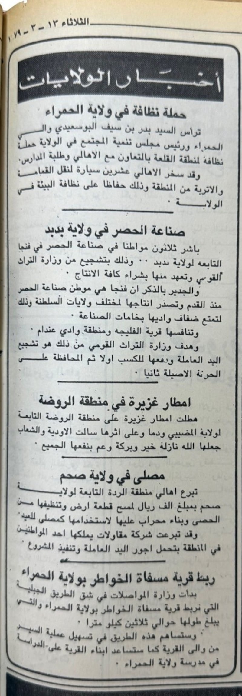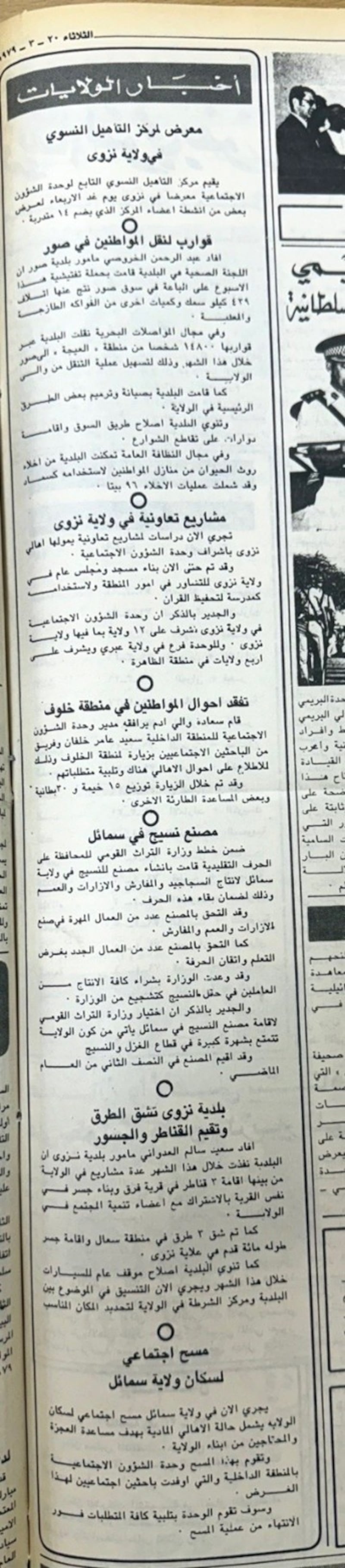 تطالعنا جريدة “عمان” في عددها الصادر يوم الثلاثاء 20 مارس 1979 بعدد من الأخبار المحلية منها: إقامة معرض لمركز التأهيل النسوي في ولاية نزوى، وتنفيذ عدد من المشروعات البلدية في ولاية صور من بينها حملات تفتيشية على الأسواق، ونقل المواطنين ما بين منطقة العيجة وصور الساحل عن طريق القوارب، وصيانة وترميم عدد من الطرق الداخلية بالولاية، وإنشاء مصنع نسيج في سمائل لإنتاج السجاجيد والمفارش والإزارات، وذلك ضمن خطط وزارة التراث القومي للمحافظة على الحرف التقليدية.