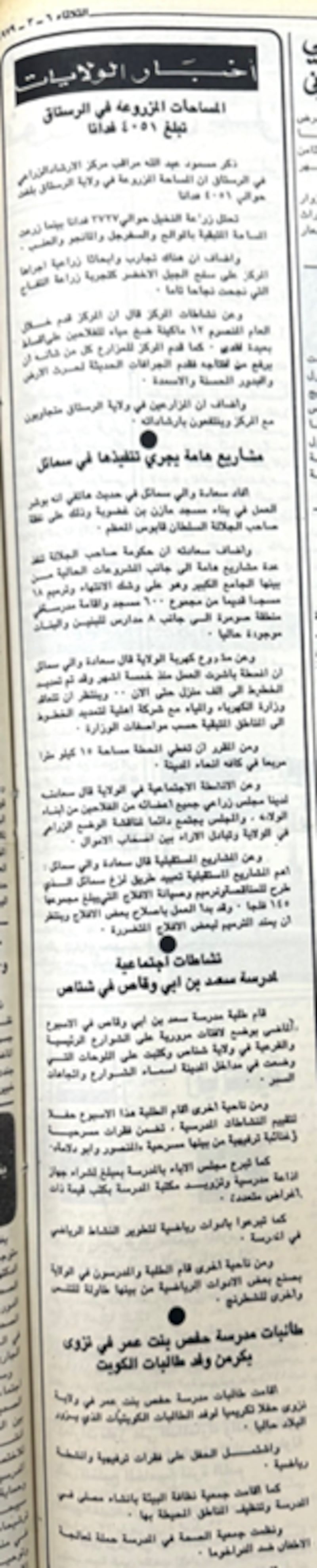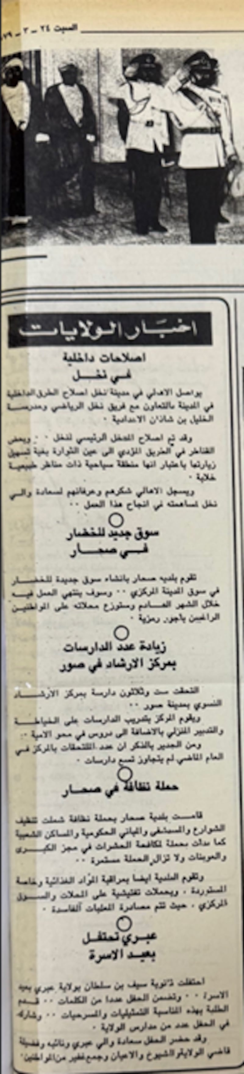 من ضمن أخبار الولايات المحلية التي نشرتها جريدة “عمان” في عددها يوم السبت 24 مارس 1979: مواصلة أهالي نخل إصلاح الطرق الداخلية بالتعاون مع فريق نخل الرياضي ومدرسة الخليل بن شاذان الإعدادية، وإنشاء سوق جديدة للخضار في سوق صحار المركزي، والتحاق (36) دارسة بمركز الإرشاد النسوي في ولاية صور حيث يتم تدريبهن على الخياطة، والتدبير المنزلي، ودروس في محو الأمية.
