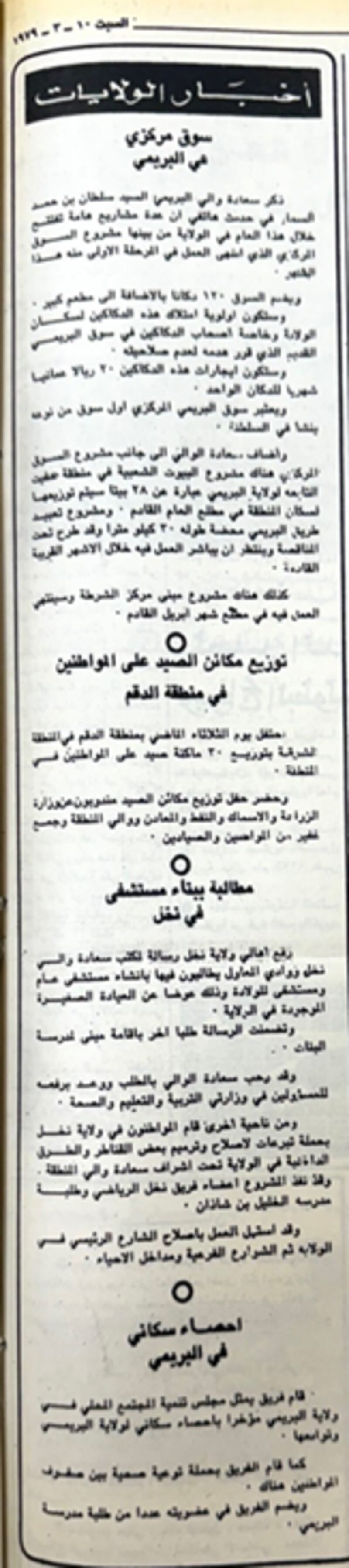 في عدد " عمان " الصادر يوم السبت 10 مارس 1979م نقرأ الأخبار المحلية التالية: تنفيذ عدد من المشروعات المهمة في البريمي من بينها مشروع السوق المركزي الذي يضم (120) دكانًا، ومشروع البيوت الشعبية في منطقة حفيت، ومشروع تعبيد طريق البريمي – محضة بطول 20 كيلو مترا، ومشروع مبنى مركز الشرطة.