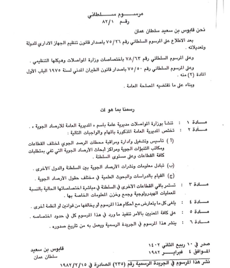 في فبراير من عام 1982م، صدر مرسومٌ سلطاني يقضي بإنشاء المديرية العامة للأرصاد الجوية ضمن هيكل وزارة المواصلات، لتتولى الإشراف المباشر على تنظيم وتطوير العمل الأرصادي في سلطنة عُمان.