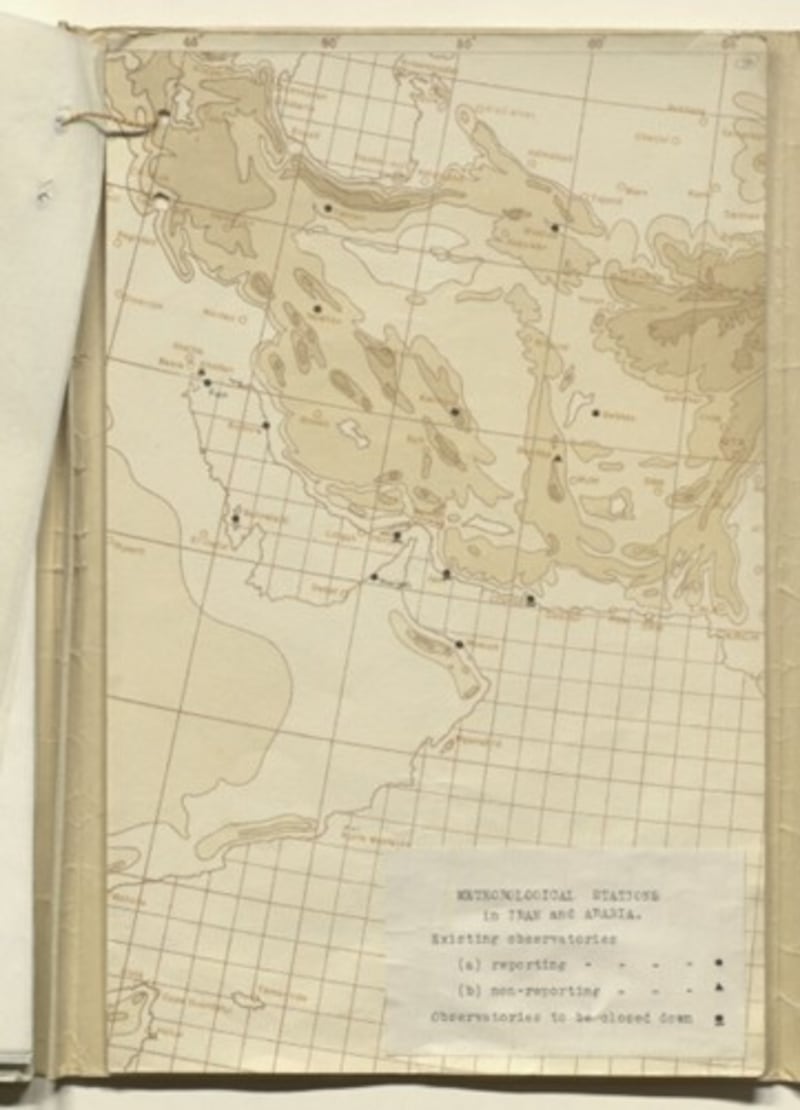 كما تُظهر الخريطة الآتية التي تعود إلى ديسمبر من عام 1935م انتشار محطات الأرصاد الجوية في منطقة الخليج وبلاد فارس، وعلى امتداد سواحل شبه الجزيرة العربية، حيث تبرز ضمن هذا الامتداد محطة الأرصاد في مسقط بوصفها إحدى النقاط المبكرة للرصد المناخي في المنطقة.