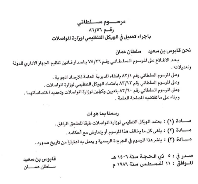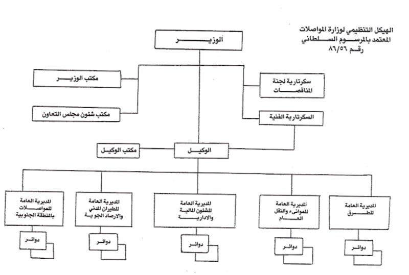 في عام 1986م، صدر مرسومٌ سلطاني بإجراء تعديلات على الهيكل التنظيمي لـوزارة المواصلات، تم بموجبه دمج المديرية العامة للطيران المدني والمديرية العامة للأرصاد الجوية في كيان إداري واحد، تحت مسمى المديرية العامة للطيران المدني والأرصاد الجوية.