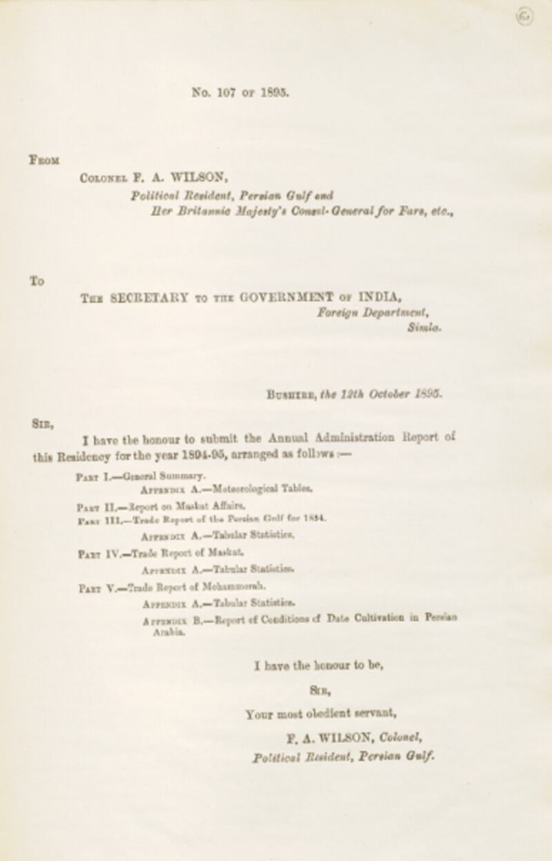 واللافت في الوثيقة السابقة إدراج “جداول أرصادية” ضمن التقرير السنوي، وهو مؤشر مبكر على اهتمام الإدارة البريطانية بجمع البيانات المناخية في منطقة الخليج، بما فيها السواحل العمانية. كما أن ورود الأرصاد ضمن تقرير إداري وتجاري يؤكد ارتباطها الوثيق بحركة السفن والتجارة البحرية، خصوصًا في موانئ مثل مسقط.