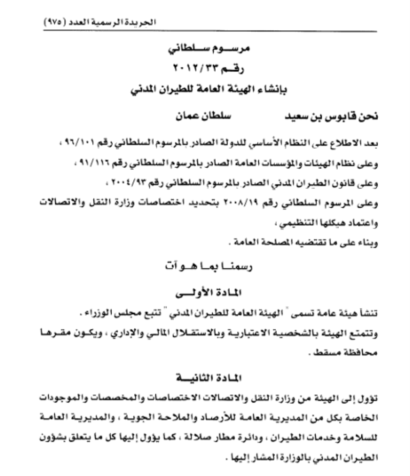 في 26 مايو 2012م، صدر المرسوم السلطاني رقم (33/2012) بإنشاء الهيئة العامة للطيران المدني، في خطوة مفصلية لإعادة تنظيم قطاع الطيران والأرصاد في سلطنة عُمان.
