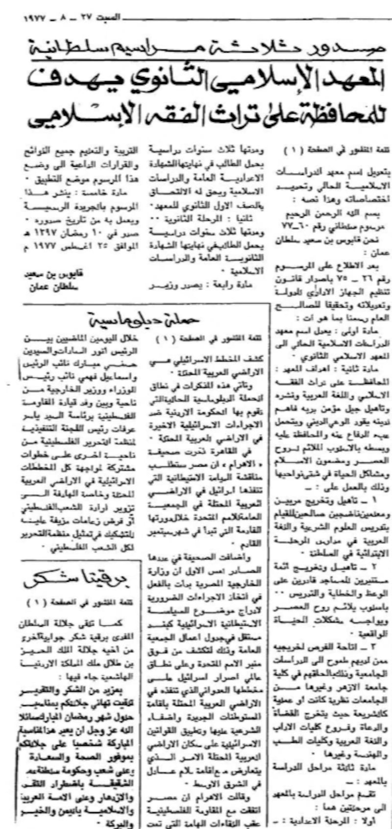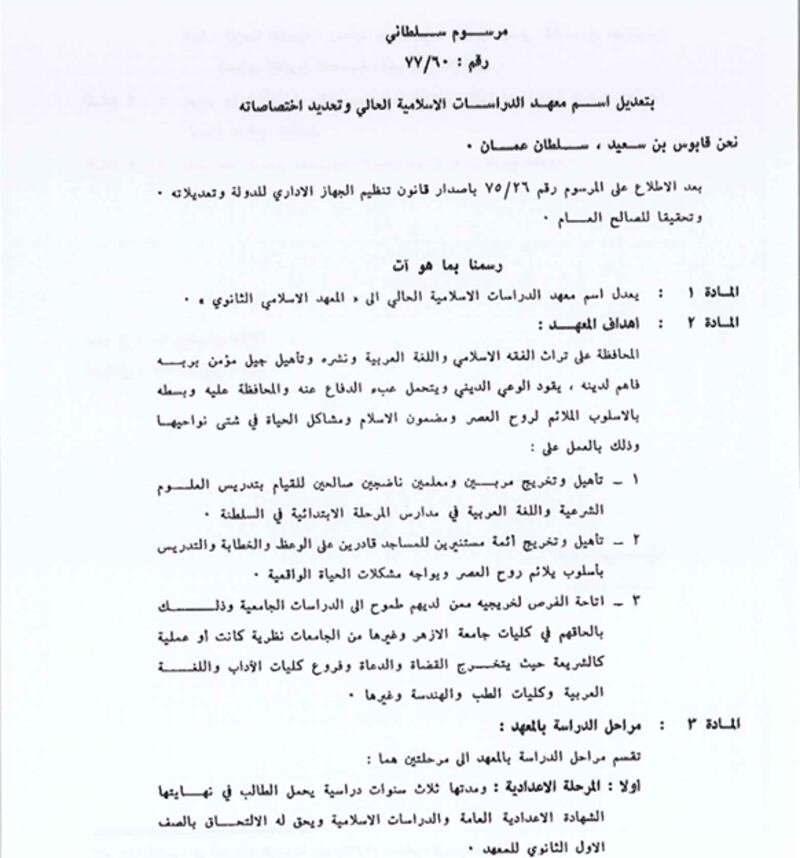 في إطار تطوير المنظومة التعليمية وتنظيم مساراتها، صدر في الخامس والعشرين من أغسطس عام 1977م المرسوم السلطاني رقم (60/77)، متضمنًا تعديل اسم “معهد الدراسات الإسلامية” ليصبح “المعهد الإسلامي الثانوي”، مع تحديد اختصاصاته وأهدافه بشكل أكثر وضوحًا.
