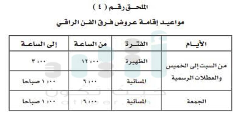 يحظر على فرق الفن الراقي أداء عروضها خلال المناسبات الدينية مثل عند رؤية هلال شهر رمضان المبارك وحتى نهاية الشهر، ليلة ويوم المولد النبوي الشريف، ليلة ويوم عرفة، ليلة ويوم رأس السنة الهجرية.