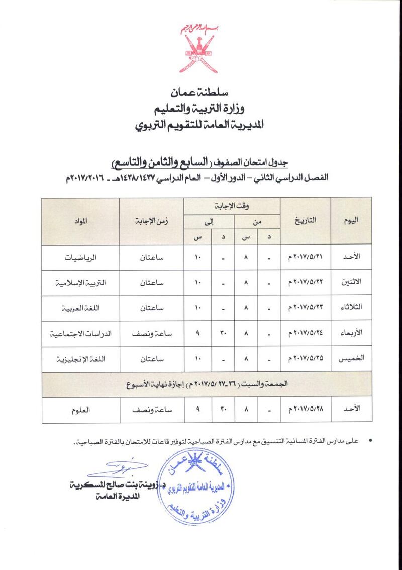 – جدول امتحان الصفوف السابع والثامن والتاسع
