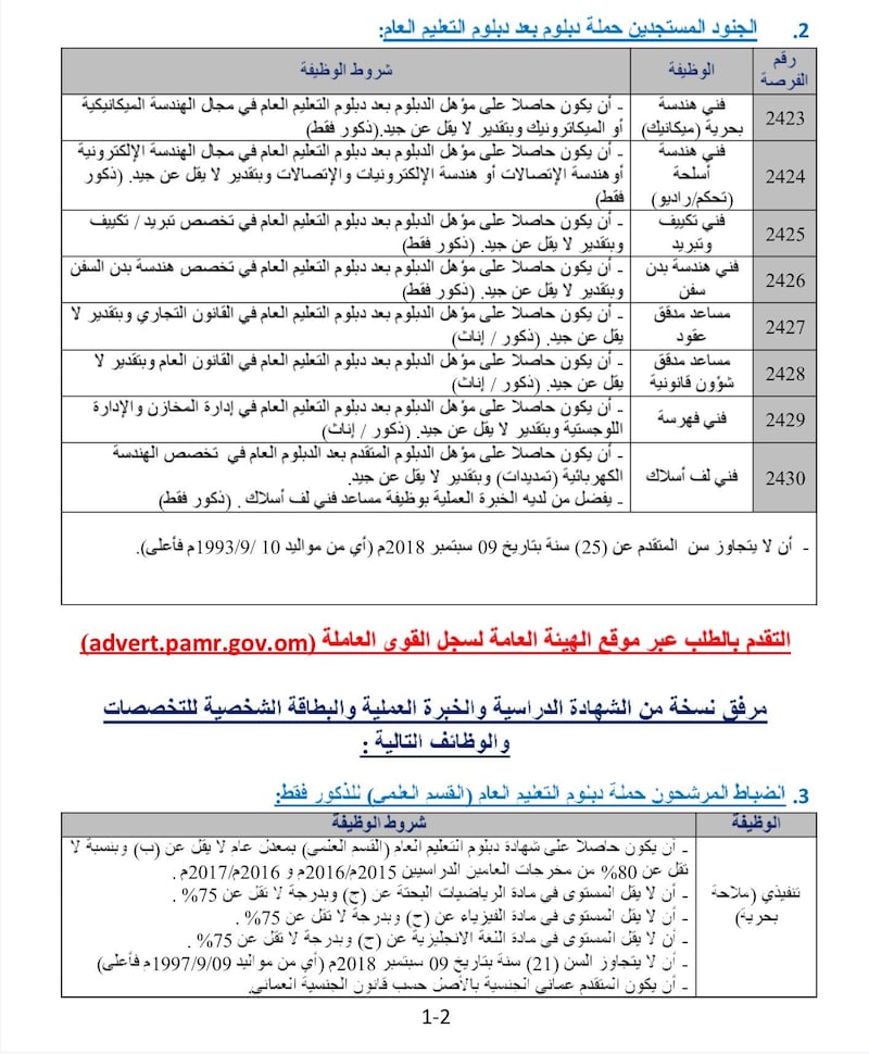 أعلنت البحرية السلطانية العمانية وبالتنسيق مع الهيئة العامة لسجل القوى العاملة أن تعلن عن فتح باب التجنيد للمواطنين الكرام للالتحاق بالبحرية السلطانية العمانية كضباط، مرشحين/جنود مستجدين (عسكريين).