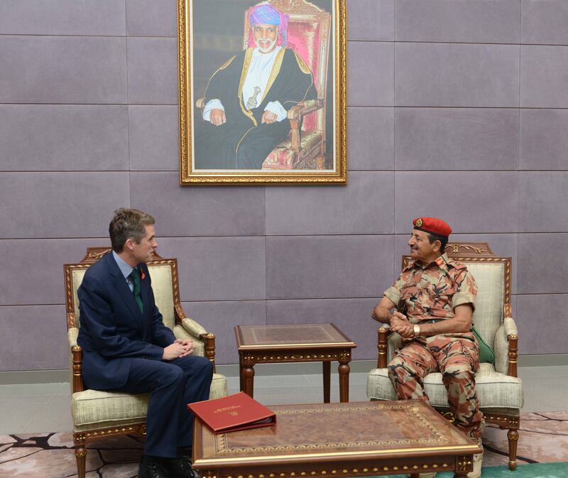 وكان في استقبال معالي وزير الدفاع البريطاني لدى وصوله مطار مسقط الدولي الفريق الركن أحمد بن حارث النبهاني رئيس أركان قوات السلطان المسلحة وعدد من كبار الضباط، كما كان في الاستقبال سعادة سفير المملكة المتحدة المعين لدى السلطنة، وملحق الدفاع البريطاني بسفارة المملكة المتحدة بمسقط.