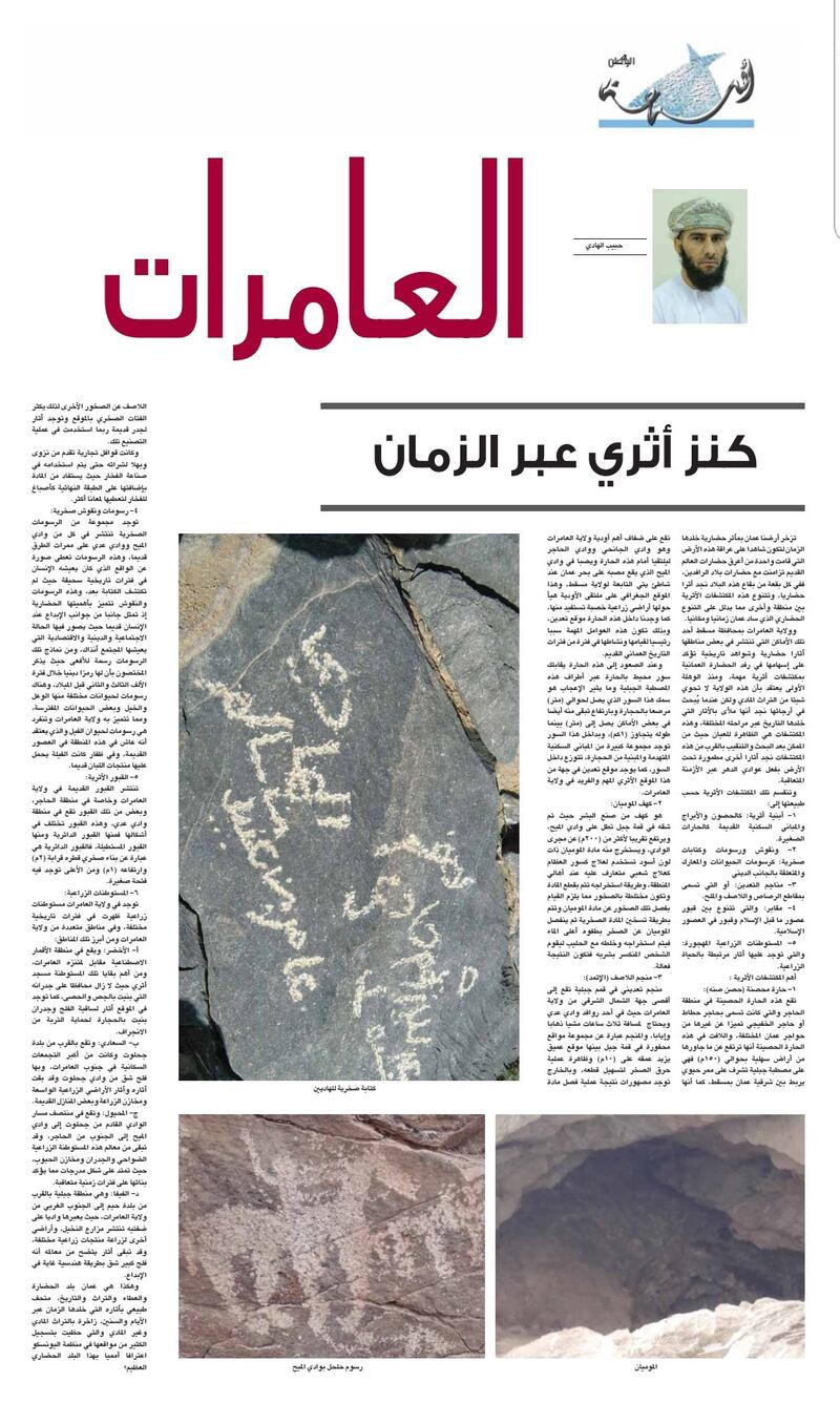 للباحث والمشتغل بالتاريخ حبيب الهادي اهتمام كبير بمجال التنقيب عن الآثار وتتبع المكتشفات الأثرية، فلا يكاد يمر يوم دون أن تجد على حسابه (التويتري) خبرًا عن اكتشافٍ هنا أو هناك، أو صورةً له وهو أمام موقعٍ أثريّ، أو قرب صخرةٍ نقش عليها بعضٌ من الرسوم، أو دُوّن على سطحها بعضٌ من التواريخ المهمّة، ومن بين المكتشفات الأثرية على مختلف أنواعها التي اقترب منها باحثنا حارة محصنة ( حصن صنه)، وتقع هذه الحارة الحصينة في منطقة الحاجر والتي كانت تسمى “بحاجر حطاط أو حاجر الخفيجي” تميزًا عن غيرها من حواجر عمان المختلفة، واللافت في هذه الحارة الحصينة أنها ترتفع عن ما جاورها من أراضي سهلية بحوالي (150 م) فهي على مصطبة جبلية تشرف على ممر حيوي يربط بين شرقية عمان بمسقط، كما أنها تقع على ضفاف أهم أودية ولاية العامرات وهو وادي الجانحي ووادي الحاجر. وكذلك البيوت الأثرية ومن بينها (بيت العود) بوادي الميح للشيخ سعيد بن سالم المعشري، وبيت الشيخ سعيد بن ناصر الكندي بالعامرات، وبيت الشيخ حبيب بن سليم الضنكي بالأخضر، بالإضافة إلى بعض الكهوف ومن بينها كهف الموميان وهو كهف تم شقه في قمة جبل تطل على وادي الميح، ويستخرج منه مادة (الموميان) ذات لون أسود تستخدم لعلاج كسور العظام كعلاج شعبي متعارف عليه عند أهالي المنطقة، ومنجم اللاصف ( الإثمد) وهو منجم تعديني في قمم جبلية تقع إلى أقصى جهة الشمال الشرقي من ولاية العامرات في أحد روافد وادي عدي ويحتاج لمسافة ثلاث ساعات مشيا ذهابًا وإيابًا، وهو عبارة عن مجموعة مواقع محفورة في قمة جبل بينها موقع عميق يزيد عمقه على (10م)، وكانت هناك قوافل تجارية تقدم من نزوى وبهلا لشرائه حتى يتم استخدامه في صناعة الفخار حيث يستفاد من المادة بإضافتها على الطبقة النهائية كأصباغ للفخار لتعطيها لمعان أكثر.