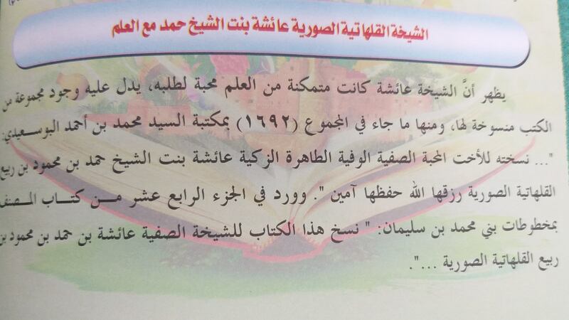 وذكر محمد بن عبد الله السيفي في صفحة 284 بالجزء الثالث من النمير أنه ورد في الجزء الرابع عشر من كتاب المصنف بمخطوطات بني محمد بن سليمان العبارة الآتية: “…نسخ هذا الكتاب للشيخة الصفية عائشة بنت حمد بن محمود بن ربيع القلهاتية الصورية…”، كما نسخ لها الجزء الثامن من كتاب “بيان الشرع” والمخطوطة موجودة بمكتبة الشيخ سيف بن حمود البطاشي كُتِب فيها ” نسخت هذا الكتاب للشيخة الرضية الزكية عائشة بنت الشيخ حمد بن محمود بن ربيع القلهاتية الصورية رزقها الله العلم الواسع”.