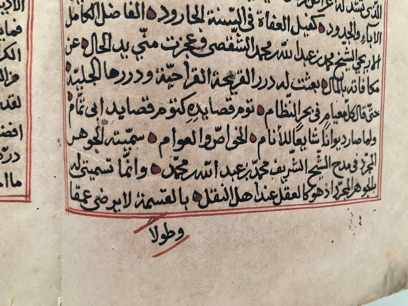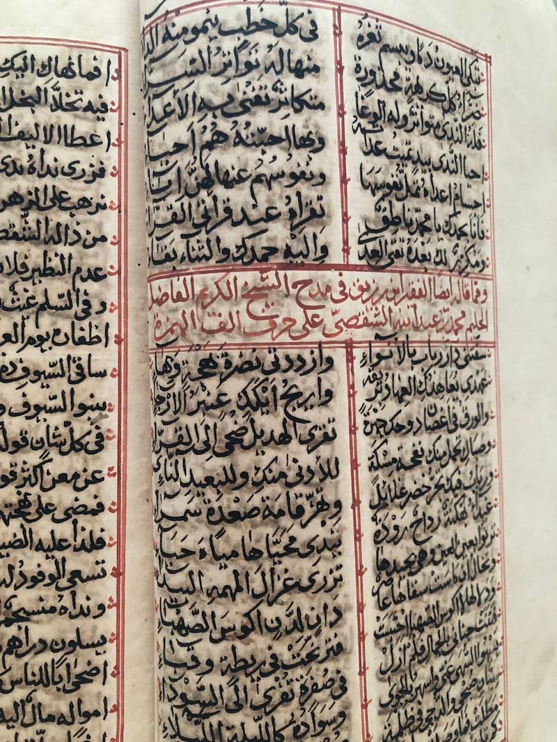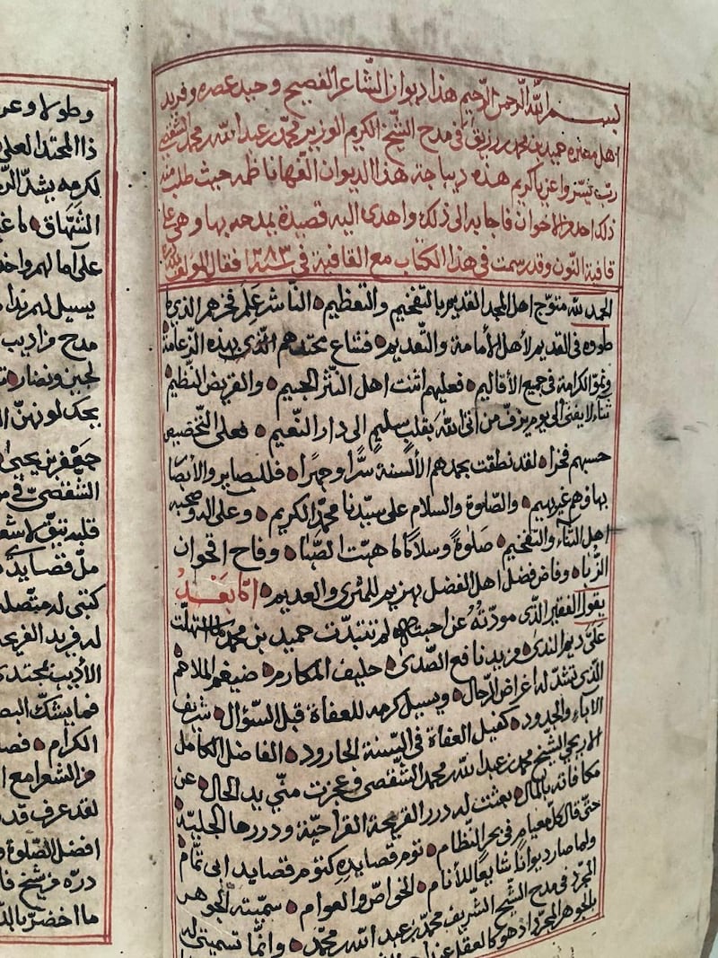 واليوم نستعرض مخطوطًا فريدًا من نوعه يوجد بين ثنايا تلك الخزانة، ألا وهو مخطوط ” الجوهر المجرّد في مدح الشريف محمد بن عبد الله بن محمد الشقصي” للمؤرخ والشاعر والأديب حميد بن محمد بن رزيق صاحب “الفتح المبين”، و”الشعاع الشائع”، و”الصحيفة القحطانية”، و”الصحيفة العدنانية”، وغيرها من المؤلفات التاريخية والأدبية المختلفة، وهذا المخطوط عبارة عن ديوان كامل ألف بائي في مدح هذه الشخصية الكريمة، وعلى الرغم من وجود مخطوطات شعرية أخرى لابن رزيق إلا أنني لم أطّلع على عنوان هذا المخطوط من قبل، ولم أجد من خلال بحثي هنا وهناك معلومات وافية عنه، مما يعني أنه قد يكون محدود الانتشار، وقد لا توجد نسخ أخرى عدا هذه الموجودة في خزانة أسرة الشيخ مسعود بن على الريامي “العودي”.