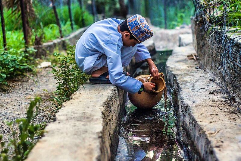 وتتم عملية تقسيم مياه فلج القرية عبر نظام فريد يعرف بـــــــ “الأثر” وهو نظام قديم ومعتمد في العديد من أفلاج السلطنة، وتوجد تسع بادات مفردها (بادة) لتوزيع مياه الفلج في سواقي البلدة وتسمى بأسماء معينة، ويتغير أدوار سقي المزارع من وقت لآخر قد يأتي صباحًا أو ظهرًا أو ليلًا.