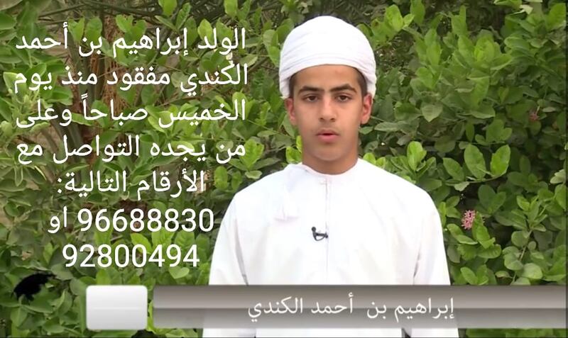 ودعا الكندي مَن يعرف أي معلومات عن ابنه التواصل مباشرة مع شرطة عمان السلطانية أو على رقمه 92800494.