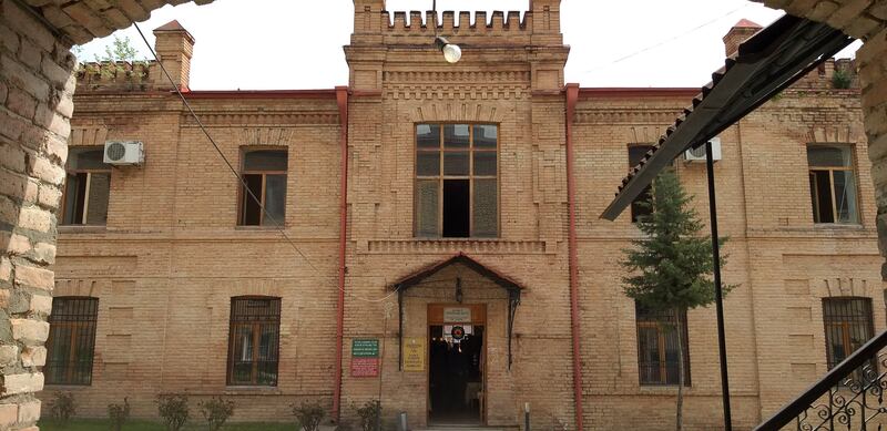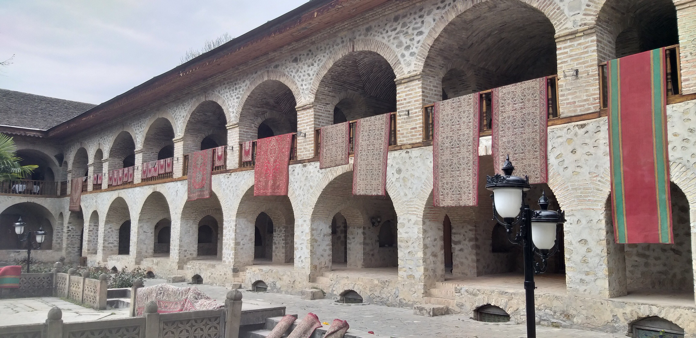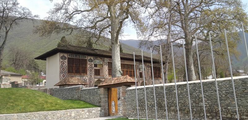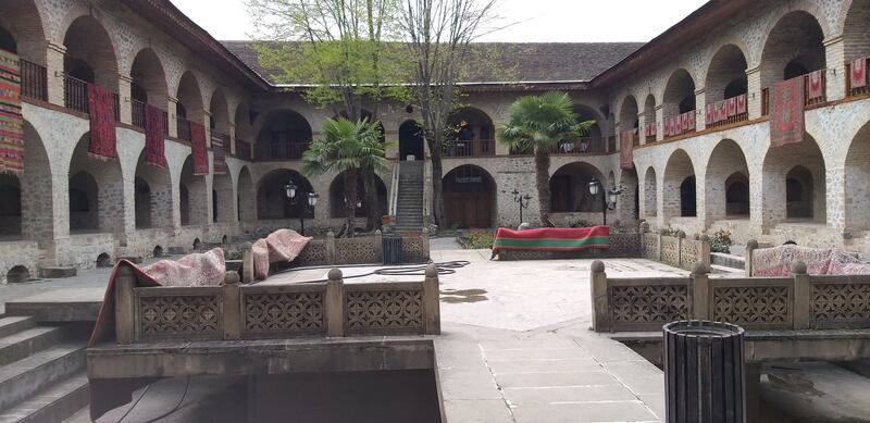 بعد خروجنا من القلعة دخلنا قصر (الخانات) الذي كان يتم ترميم بعض مبانيه، وهو قصر قديم يعود تاريخ بنائه إلى عام 1762، ويتكون من عدة أجزاء تم تحويل بعضها إلى متاحف، وتم ترميمه بين عامي 1955-1965، ويجسّد هذا القصر روعة التقليد المعماري الأذربيجاني، ومن بين ما يميزه الزجاج الملوّن الذي يغطي بعض شرفاته ونوافذه والذي تم جلبه من مدينة البندقية.