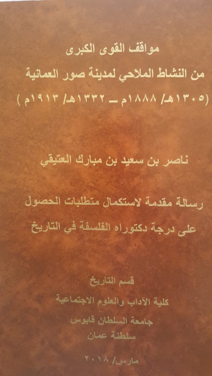 للباحث الدكتور ناصر بن سعيد العتيقي كتاب صادر في عام 2015م عن دار الفرقد السورية يتناول “الأوضاع السياسية العُمانية في عهد السلطان سعيد بن تيمور 1932 ـ 1954م”، وهو في الأساس عنوان لرسالة الماجستير التي قدمها بمعهد البحوث والدراسات التابع لجامعة الدول العربية في عام 2007م، كما إنه بصدد الانتهاء من طباعة كتابه الثاني المتعلق بمواقف القوى الكبرى من النشاط الملاحي لمدينة صور العمانية 1888-1913.