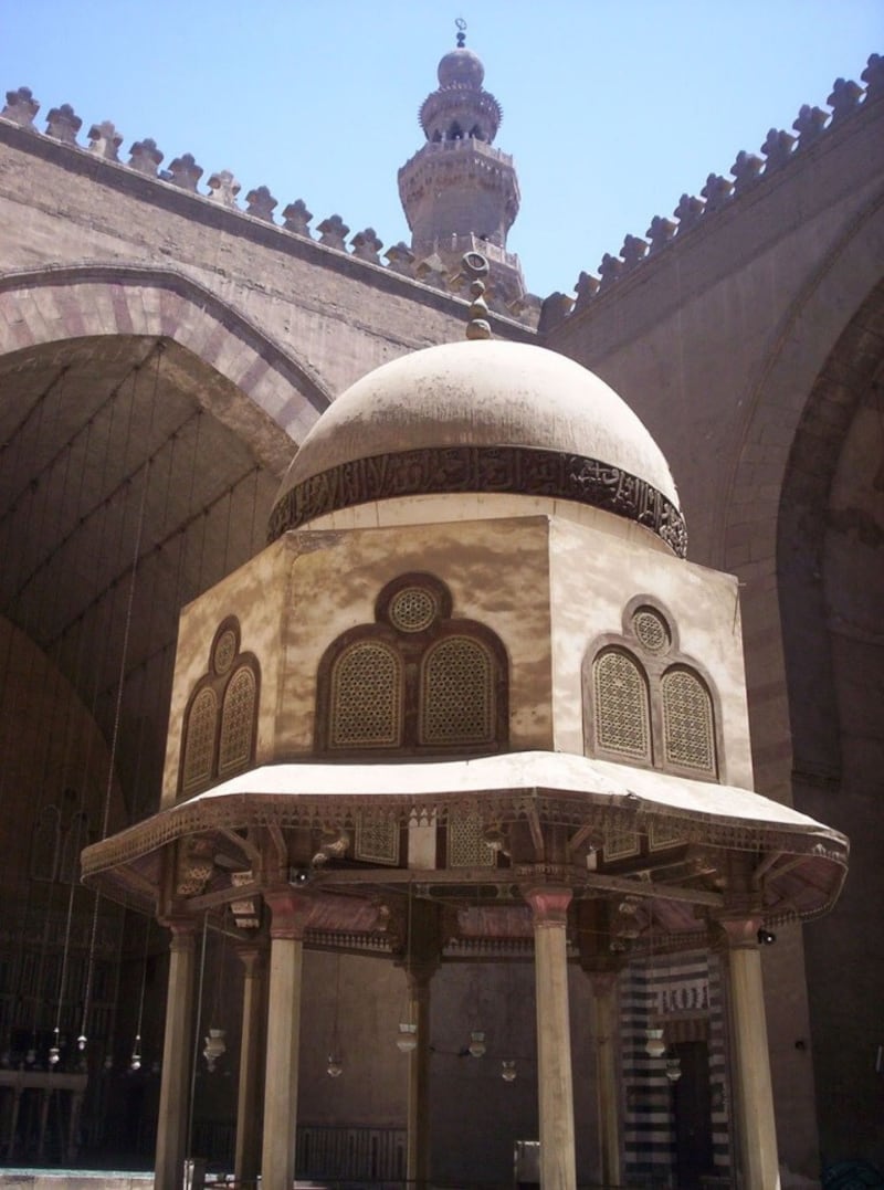 يتألف صحن مدرسة ومسجد السلطان حسن، من مساحة مربعة الشكل ومنتظمةالأبعاد بموجب مساحة كلية حوالي (34×32) مترًا تفتح عليه أربعة أيونات منالجهات الأربع ،ويتوسط الفناء الميضأة، التي تعلوها قبة خشبية محمولة على ثمانيةأعمدة رشيقة من الرخام الأبيض، وقد سجلت بدائرة خوذة القبة من الداخل كتاباتنسخية قرآنية- يشرف على الفناء أربعة إيوانات متقابلة ومعقودة أكبرها وأهمها إيوانالقبلة، تنحصر وظيفتها المعمارية منذ التأسيس على أنها أربع مدارس لتعليم المذاهبالإسلامية الأربعة كما كتب على هذه الأواوين “أمر بإنشائها السلطان الشهيدالمرحوم الملك الناصر حسن بن محمد بن قلاوون في شهور سنة 764 هجرية”.