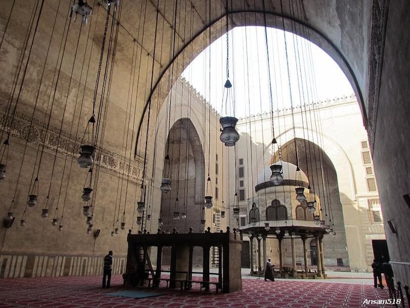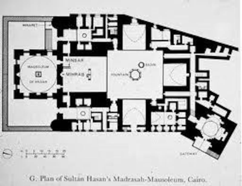ويذكر الورثيلاني؛ الرحالة المغربي في وصف مسجد ومدرسة السلطان حسن بأنهمسجد لا ثاني له في مصر ولا في غيرها من البلاد في فخامة البناء وجماله ونباهته.-من جهة أخرى يوضح المؤرخ المصري تقي الدين المقريزي في كتابه “الخطط” لايُعرَف في بلاد الإسلام معبد(مسجد) من معابد المسلمين يحاكي هذا الجامع, فيعجائبَ البنيان؛ كما يذكر أن إيوانه الكبير بجهة القبلة يبلغ 60 ذراعًا وهو بذلكأكبر من إيوان كسرى بالمدائن بخمسة أذرع مما يدل على مدى اتساع السطح المقبىوالمغطي للإيوان.