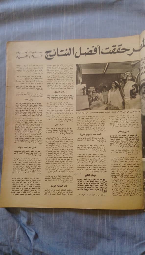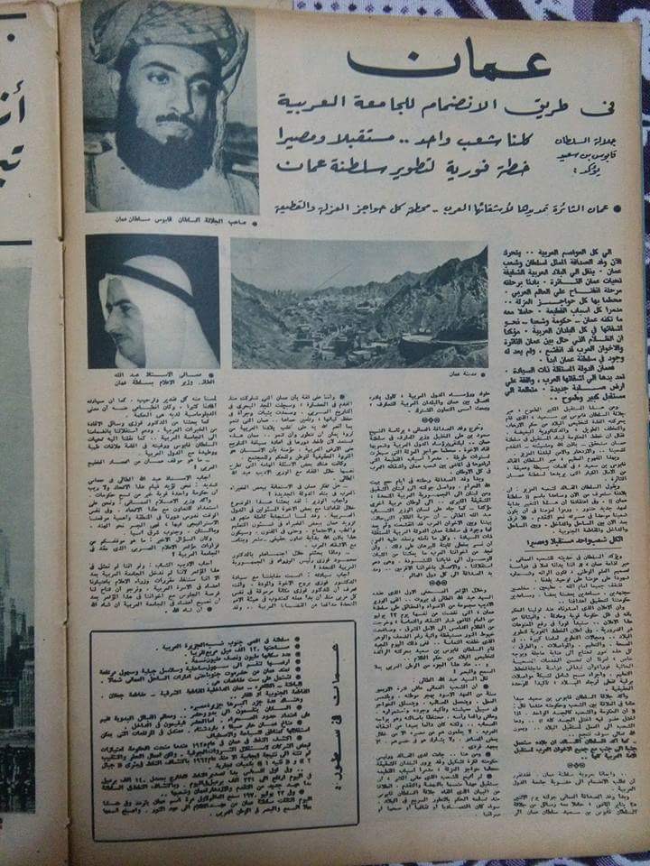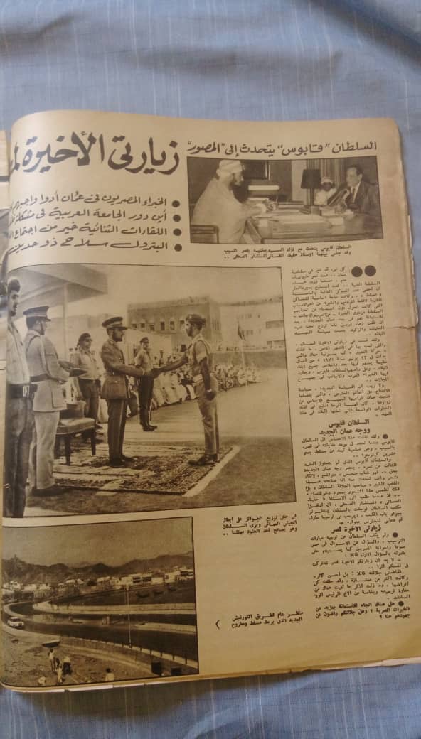 ونطالع في مجلة “الإذاعة” المصرية عدد 21 أغسطس 1957 حوارًا مع الشيخ صالح بن عيسى حول الوضع في عُمان، بينما نشرت مجلة ” آخر ساعة” المصرية في عددها بتاريخ 3 مارس 1971 موضوعا عن قرب انضمام السلطنة للجامعة العربية، وتصريحا لجلالة السلطان قابوس يؤكد أنه ” كلنا شعبٌ واحد..مستقبلاً ومصيرا”، وعلى أن هناك خطةً فورية لتطوير سلطنة عمان، وأن عمان تمد يدها لأشقائها العرب محطمةً كل حواجز العزلة والقطيعة”، أما مجلة ” المصوّر” المصرية فقد كان لها حوار خاص مع صاحب الجلالة عام 1973 تقريبا حول موضوعات عديدة تتعلق بعمان الجديدة، وعن زيارته الأخيرة لمصر والتعاون العماني المصري، ورغبة السلطنة في الاستفادة من الخبرات المصرية في كافة المجالات، كما أكد دور الجامعة العربية، وأهمية اللقاءات الثنائية وأنها خير من الاجتماعات العامة، ونبّه جلالته بأن البترول سلاح ذو حدّين وينبغي الاستفادة منه بشكلٍ مناسب، وغيرها من الموضوعات والقضايا التي طرحتها أسئلة الصحفي فؤاد السيّد.