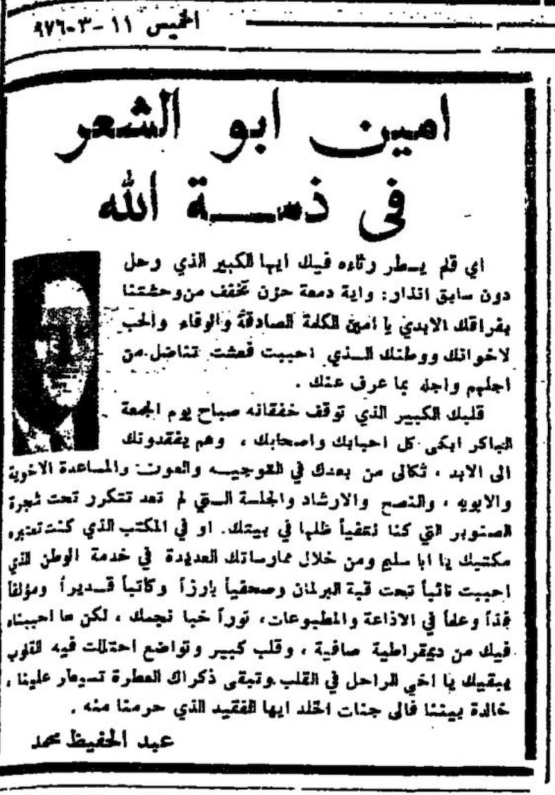 2- أمين أبو الشعر.. رجل الإعلام والقانون، 9 فبراير 2009، موقع “صحفي”، http://www.sahafi.jo/arc/