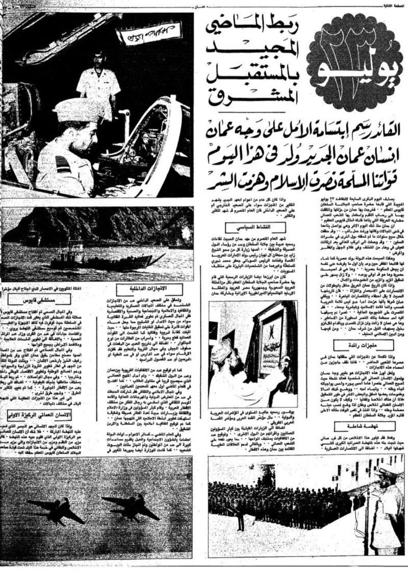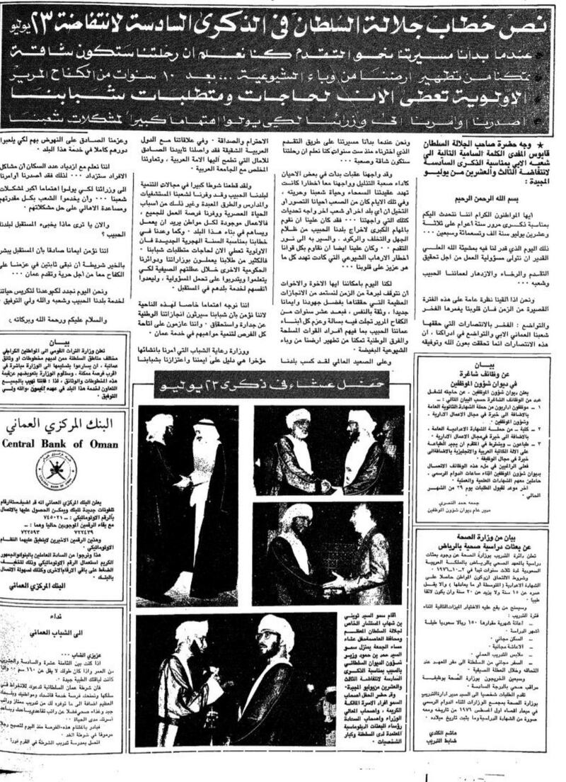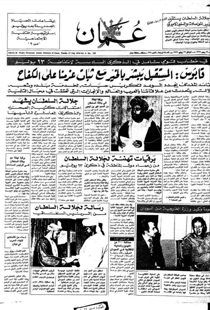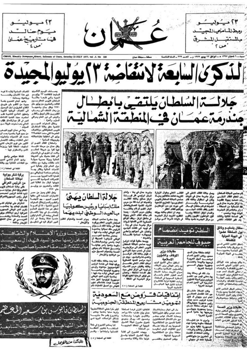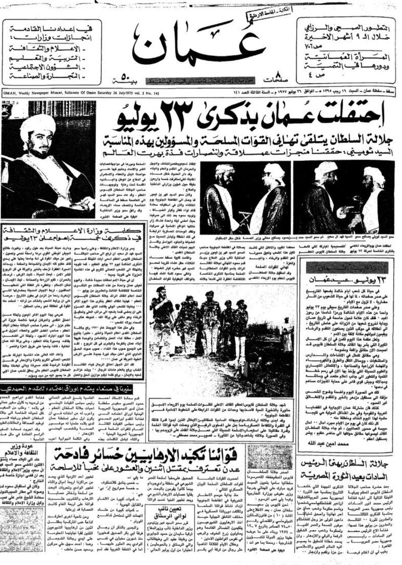 تورد الأهرام المصرية في عددها بتاريخ 23 يوليو 1978 موضوعا حول احتفال السلطنة بالعيد الوطني الثامن، وفي مقدمته ذكرت الجريدة أنه ” من ثماني سنوات قاد السلطان قابوس بن سعيد حركةً إصلاحية حطّم بها الأغلال التي كانت تعوق مسيرة الشعب العماني، وكسر القيود التي وضعت بلاده في عزلةٍ خلف أسوار التخلف أكثر من أربعين عاما، وعندما قام السلطان قابوس بحركته هذه لم يكن أحدٌ يتصور أنه يستطيع نقل بلاده من حياة القرون الوسطى إلى حياة العالم المعاصر”.