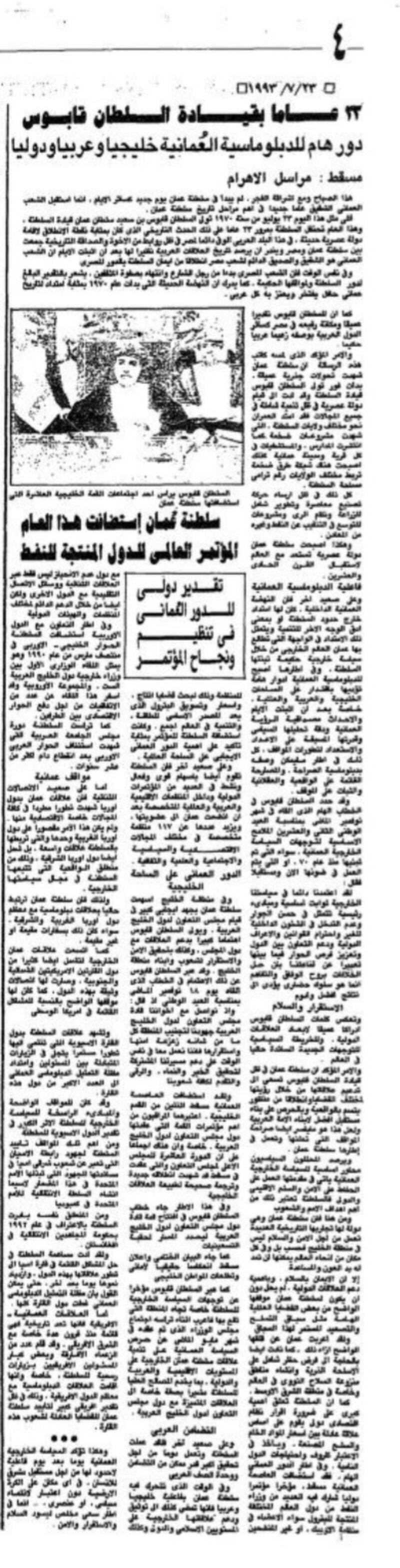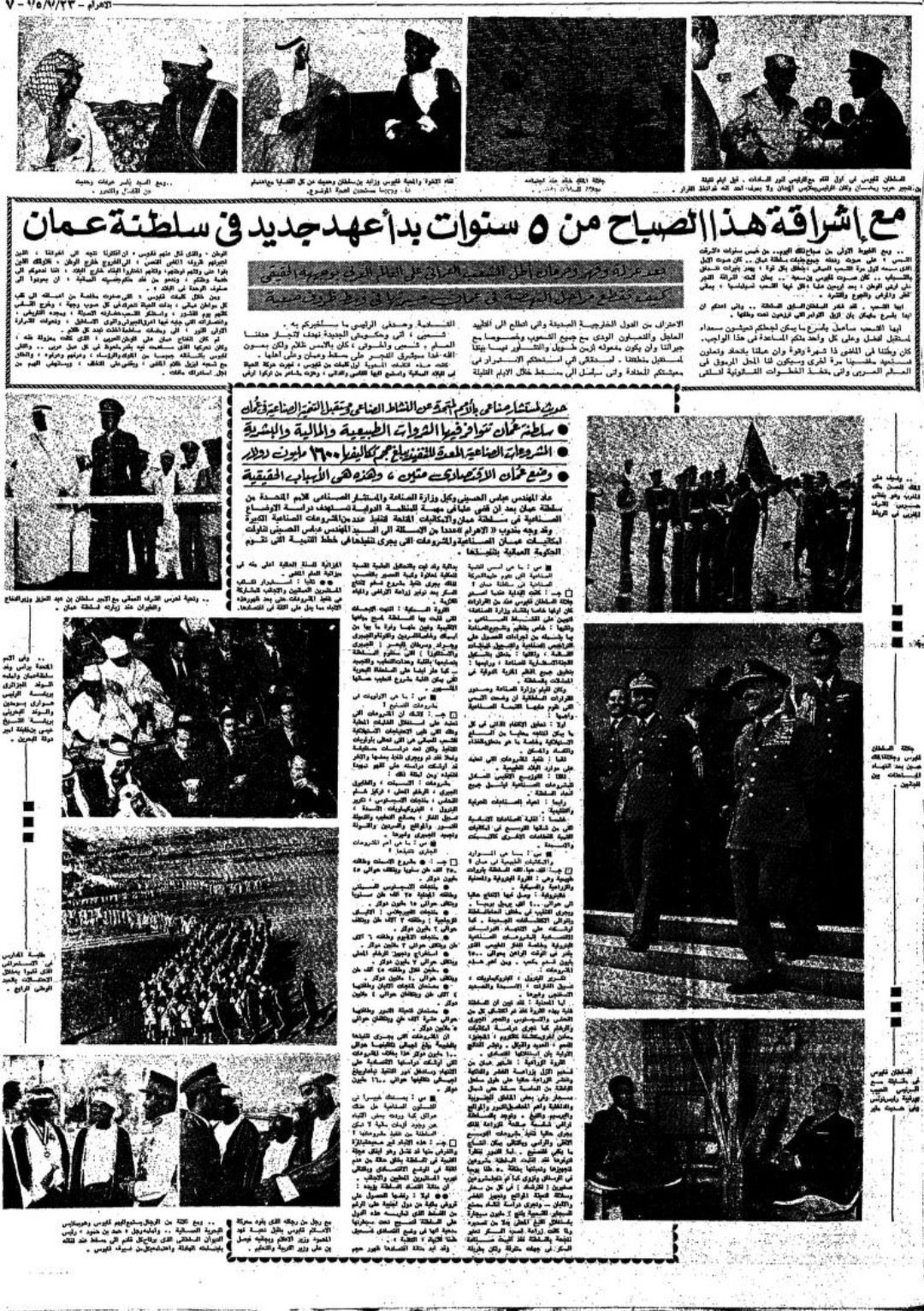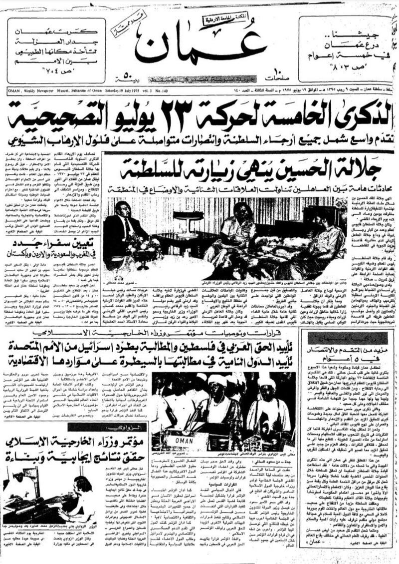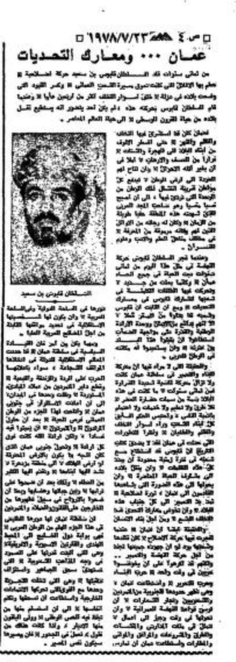 تورد الأهرام المصرية في عددها بتاريخ 23 يوليو 1978 موضوعا حول احتفال السلطنة بالعيد الوطني الثامن، وفي مقدمته ذكرت الجريدة أنه ” من ثماني سنوات قاد السلطان قابوس بن سعيد حركةً إصلاحية حطّم بها الأغلال التي كانت تعوق مسيرة الشعب العماني، وكسر القيود التي وضعت بلاده في عزلةٍ خلف أسوار التخلف أكثر من أربعين عاما، وعندما قام السلطان قابوس بحركته هذه لم يكن أحدٌ يتصور أنه يستطيع نقل بلاده من حياة القرون الوسطى إلى حياة العالم المعاصر”.