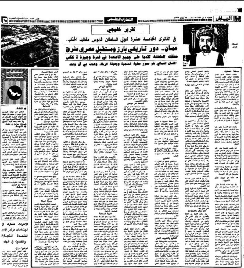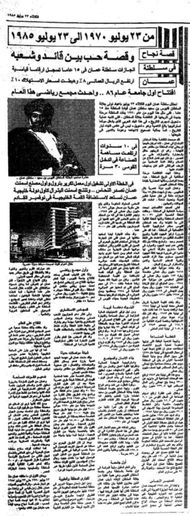هكذا عنونت جريدة “الرياض” السعودية تقريرها في عدد 23 يوليو 1985 الذي جاء بحجم صفحة كاملة للاحتفاء بالذكرى الخامسة عشرة لتولي السلطان قابوس مقاليد الحكم، وأشارت فيه إلى أن السلطنة حققت تقدما على جميع الأصعدة في فترةٍ وجيزةٍ لا تقاس، وأن الإنسان العمانيّ هو محور عملية التنمية ووسيلة الرخاء وهدفه في آنٍ واحد.