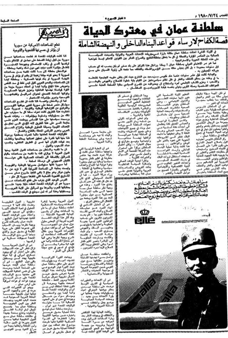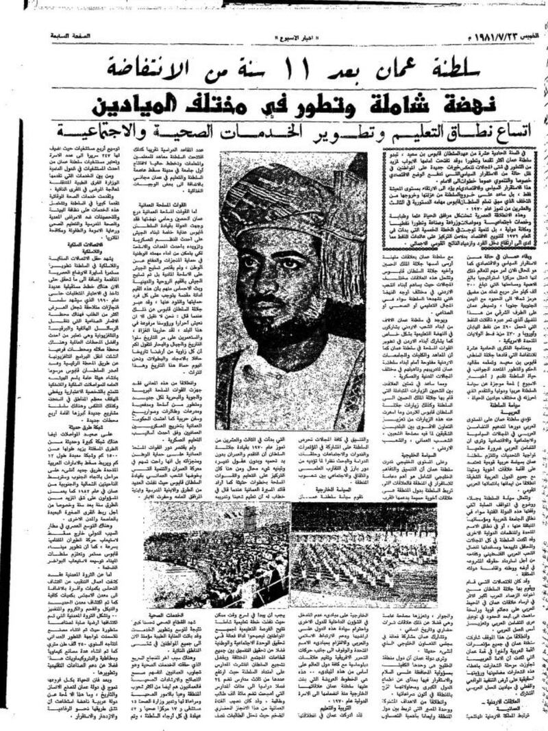 تقول جريدة “أخبار الأسبوع” الأردنية في مقدمة عددها الصادر بتاريخ 23 يوليو 1981: ” في السنة الحادية عشر من عهد السلطان قابوس بن سعيد، تبدو عمان أكثر تقدما وتطورا، وقد تفتحت أمامها الأبواب لمزيد من التطور في شتى المجالات تنعكس خبرات جديدة على المواطنين في ظل حالة من الاستقرار السياسي التي تدفع الوضع الاقتصادي خصوصاً والتنموي عموماً خطوات إلى الأمام”.