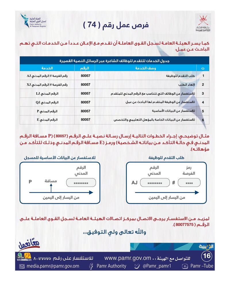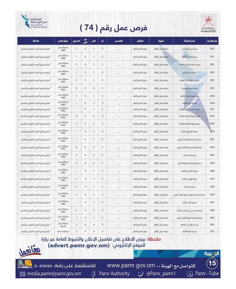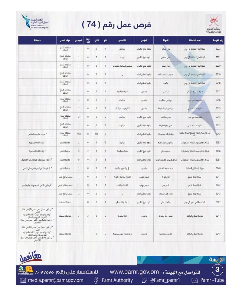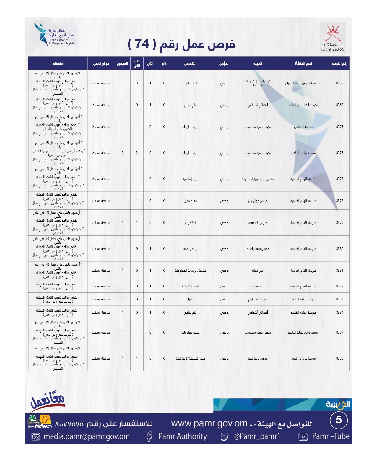 أعلنت الهيئة العامة لسجل القوى العاملة وبالتنسيق مع وزارة القوى العاملة عن ملحق فرص العمل رقم (74) والذي يحتوي على 840 فرصة وظيفية.