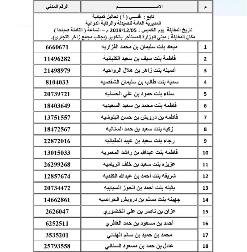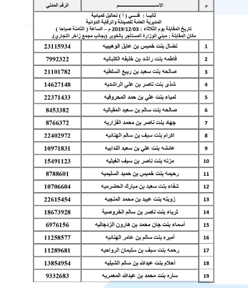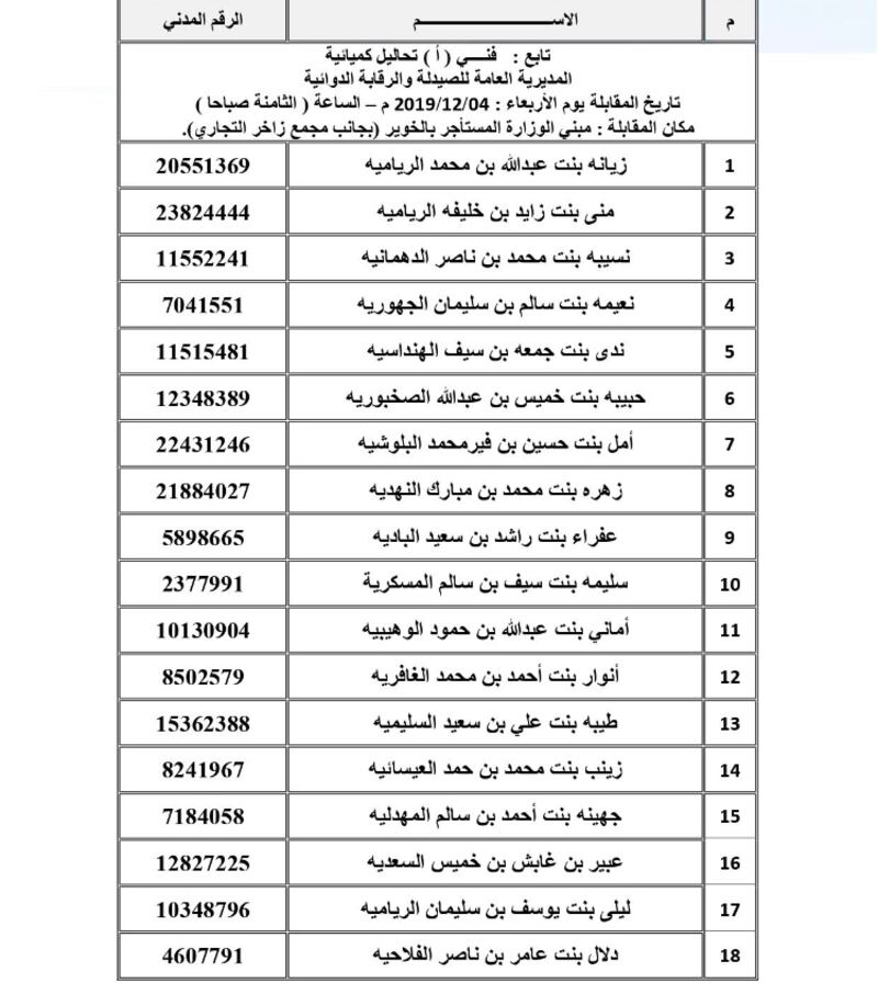 أعلنت وزارة الصحة أسماء المواطنين الذين سبق لهم أن تقدموا بطلباتهم لشغل وظيفة فني ( أ ) تخصص ( تقنية حيوية – تحاليل كيميائية ) ، ليحلوا محل الوافدين بالمديرية العامة للصيدلة والرقابة الدوائية،