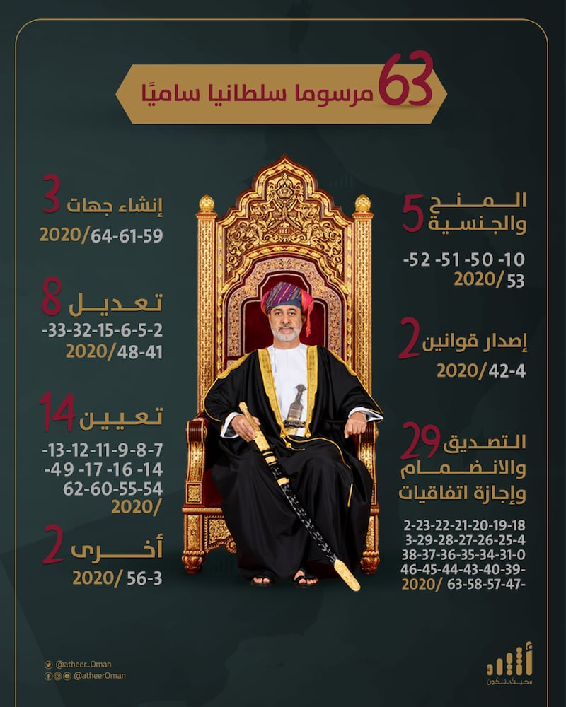 جاء تقسيم المراسيم السلطانية الـ 63 التي أصدرها جلالة السلطان منذ توليه مقاليد الحكم، كالآتي: